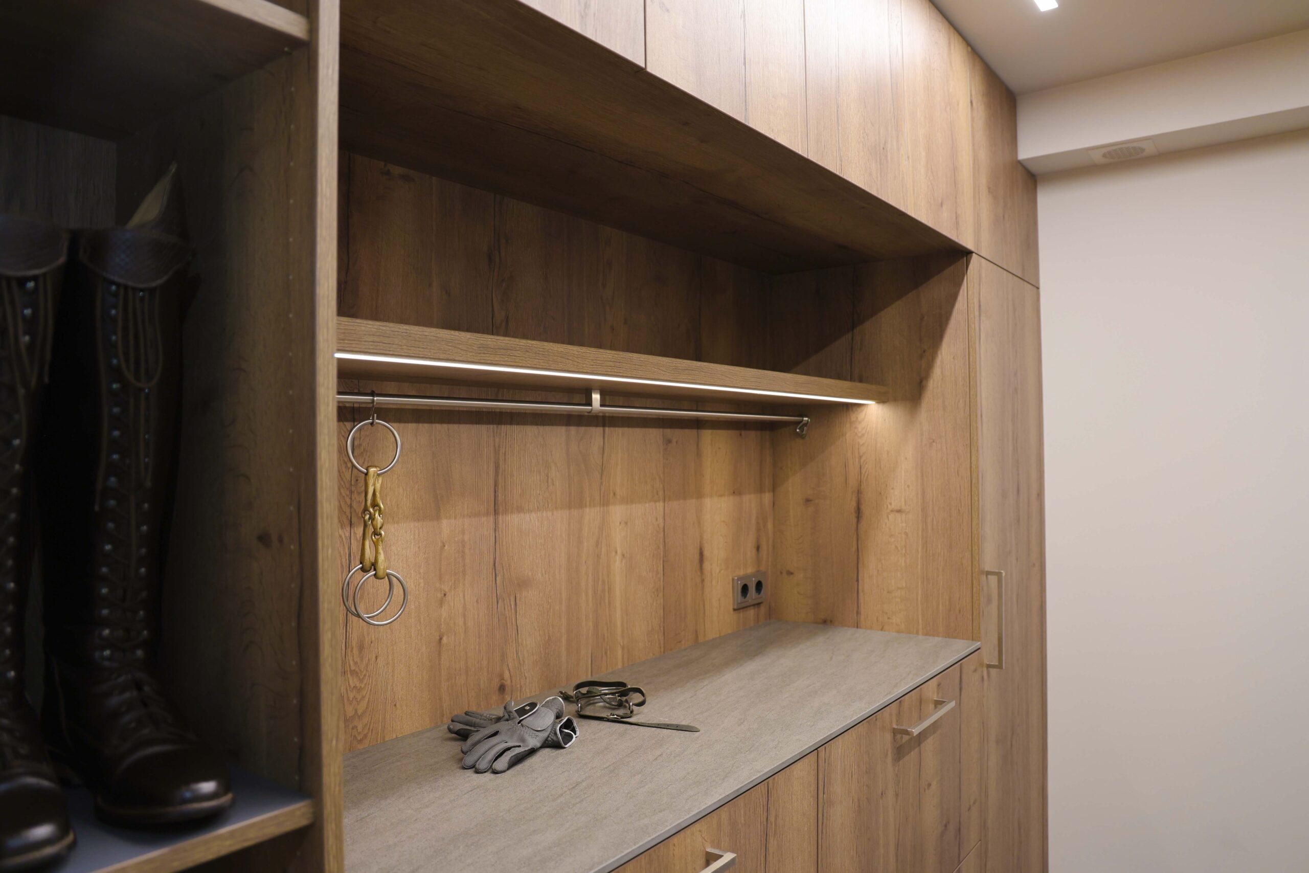 Ein Raum, der Ordnung schafft und die Leidenschaft für den Reitsport sichtbar macht – durchdachte Stauraumlösungen aus hochwertigen Materialien, individuell geplant und gefertigt.