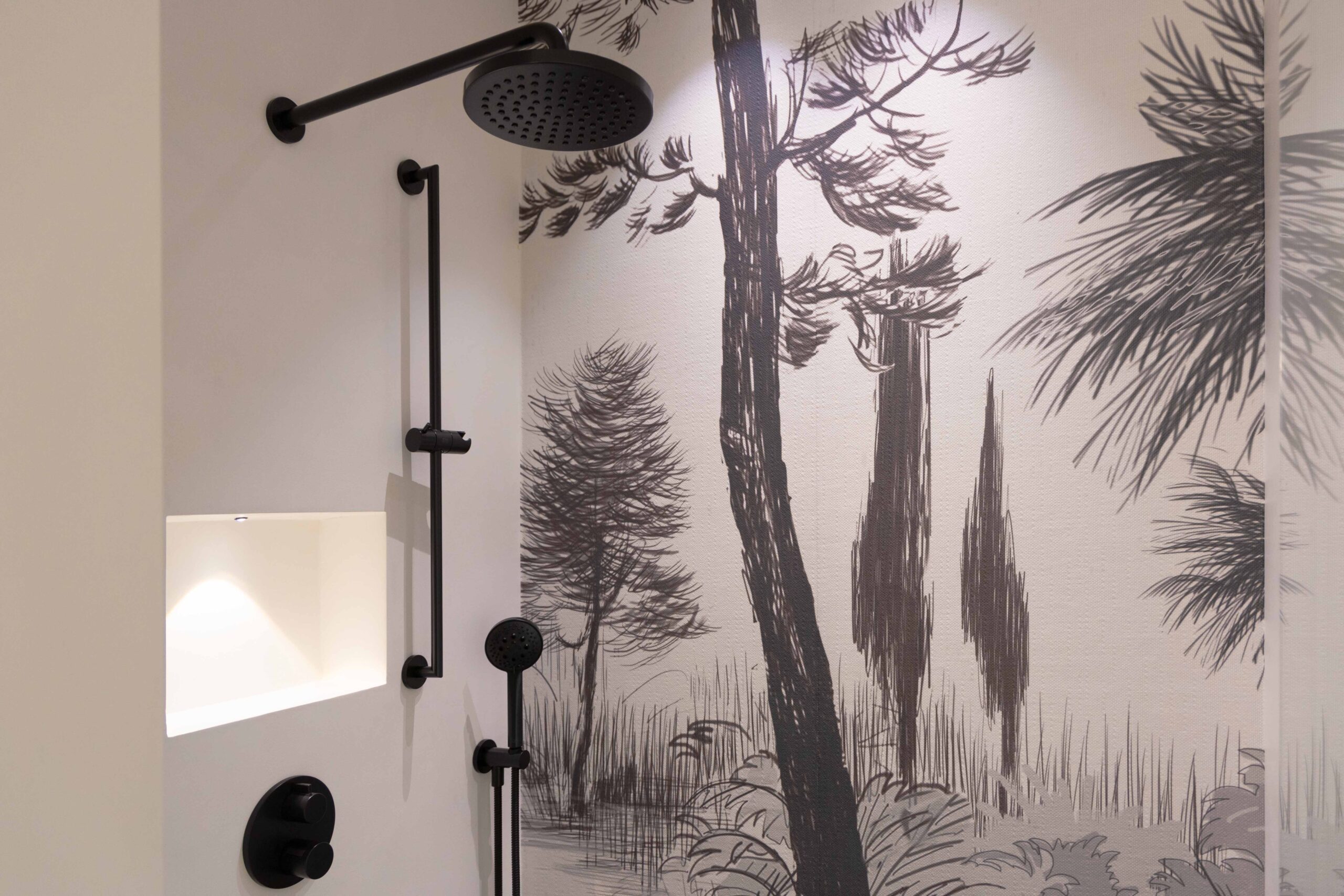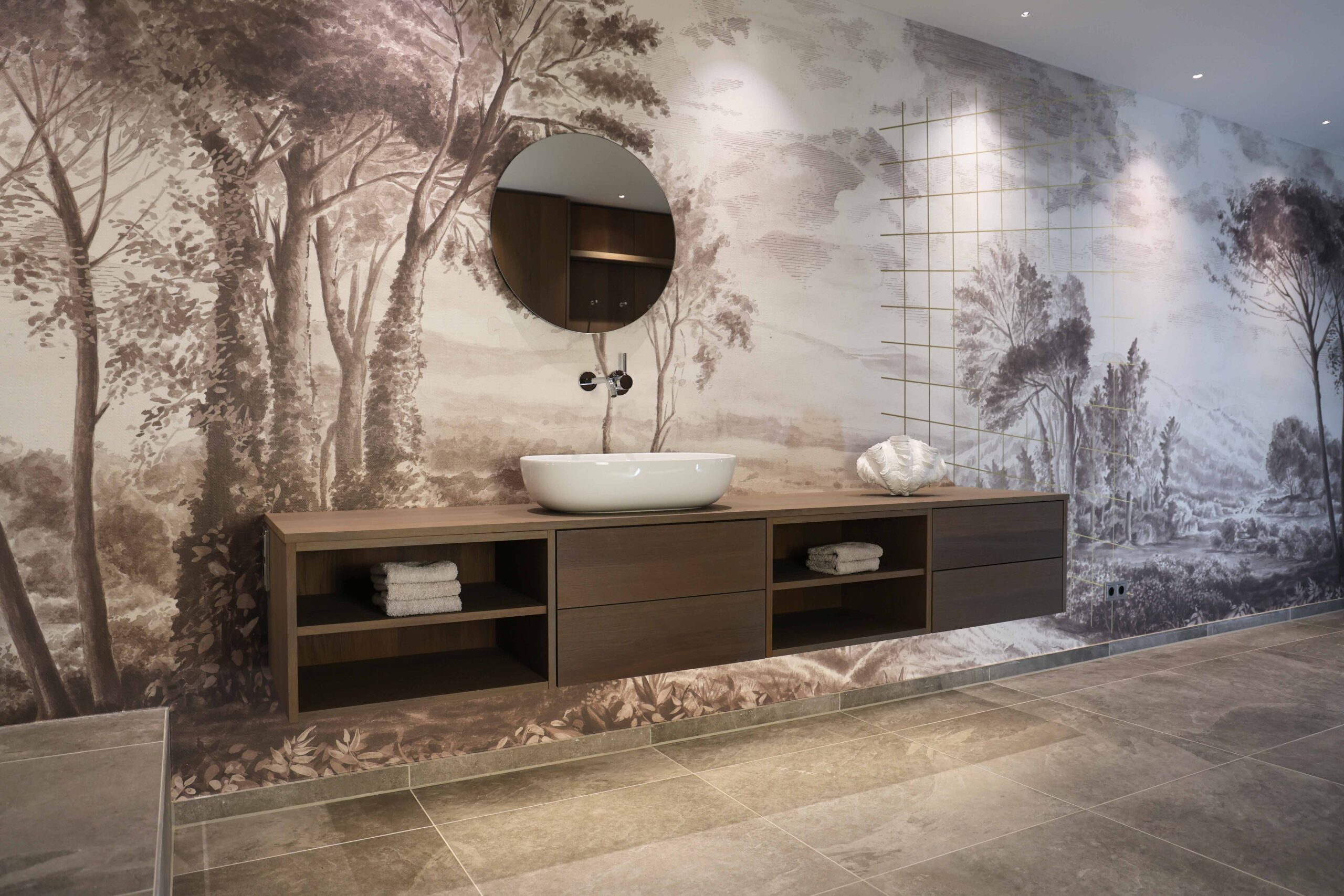 Maßgefertigte Möbel bieten Stauraum für Handtücher und Pflegeprodukte, während offene Regalfächer dekorative Elemente aufnehmen. Der Waschtisch aus dunkler Eiche mit aufgesetzten Keramikbecken fügt sich elegant in das Ambiente ein. Ein markanter Blickfang ist die großflächige Tapete, deren sanfte Braun- und Naturtöne die Farbigkeit des Möbels aufgreifen. Das Motiv mit Bäumen und Landschaftselementen bringt eine ruhige, beinahe malerische Wirkung in den Raum und verstärkt den Charakter eines privaten Rückzugsortes.