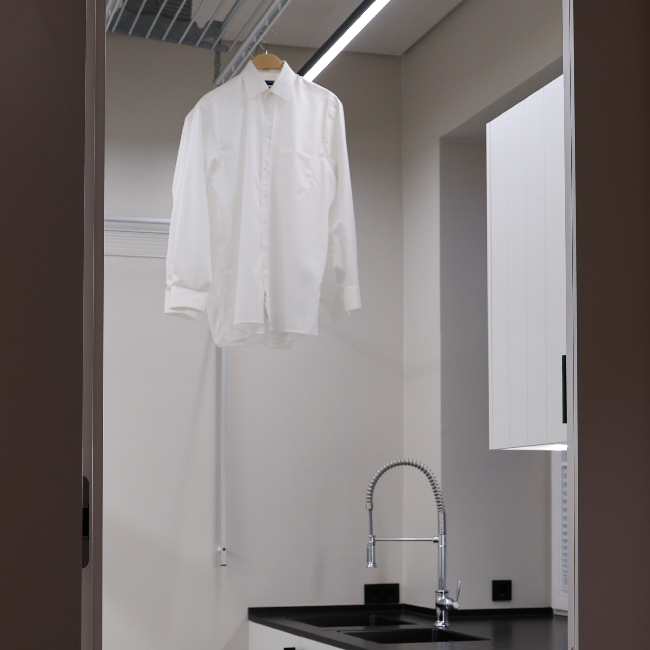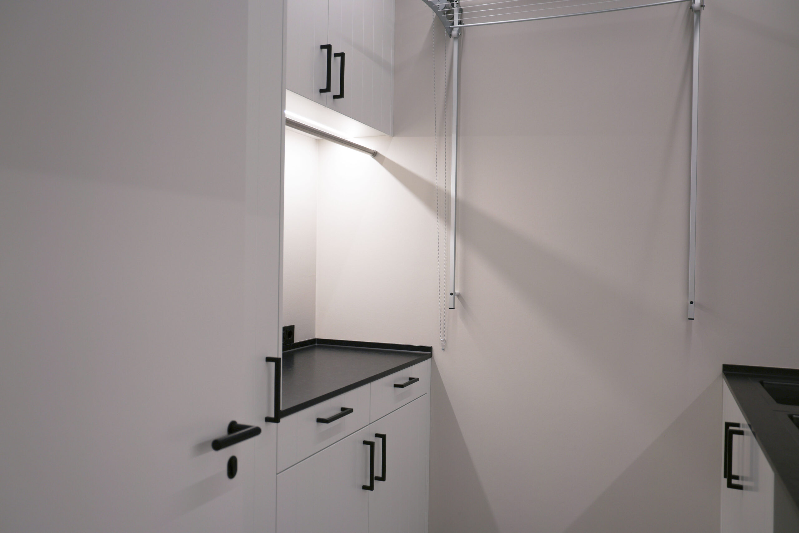 Der Hauswirtschaftsraum greift das Gestaltungskonzept der Küche auf: geriffelte Fronten, schwarze Griffe und eine geradlinige Struktur. Neben einer großzügigen Arbeitsfläche und einem integrierten Waschbecken erleichtert ein an der Decke montierter Wäscheständer den Alltag erheblich. Er lässt sich per Fernbedienung hoch- und herunterfahren. Damit verschwindet ein oft lästiges Alltagsproblem: kein platzeinnehmender Wäscheständer mehr, der im Weg steht, sondern eine elegante, platzsparende Lösung, die Ordnung und Komfort spürbar steigert.