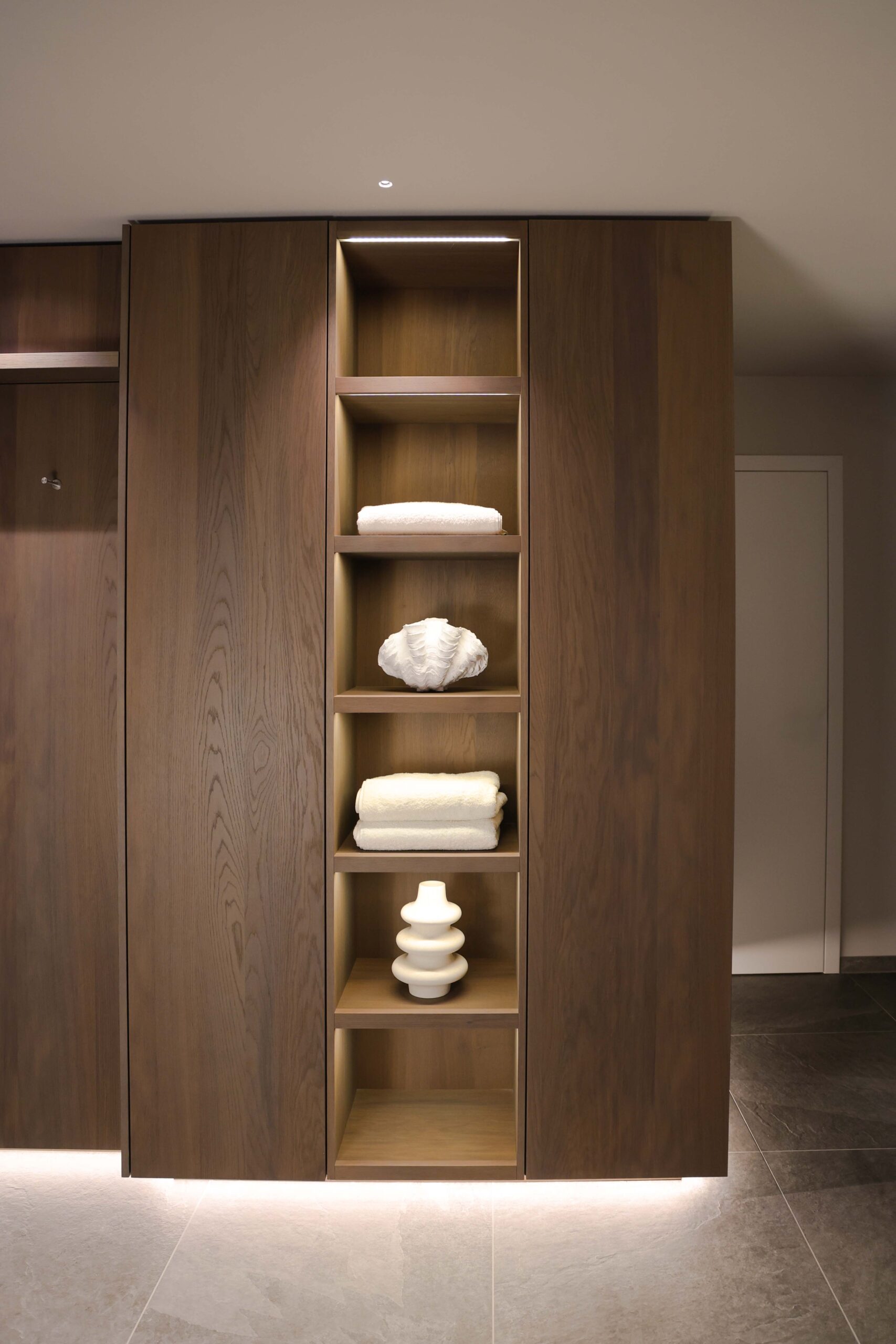 Der große Wandschrank ist zugleich raffiniert und praktisch: Er bietet mit seinen Haken aus Edelstahl nicht nur eine Aufhängemöglichkeit für Bademäntel und Handtücher, sondern dient auch als Türgriff. Hinter der unscheinbaren Tür liegt die Technik des Wellnessbereiches versteckt, die stets zugänglich sein muss. Indirekte Lichtakzente entlang des Schranksockels und der Regalfächer lassen das Möbelstück fast schweben und schaffen eine sanfte Grundstimmung.