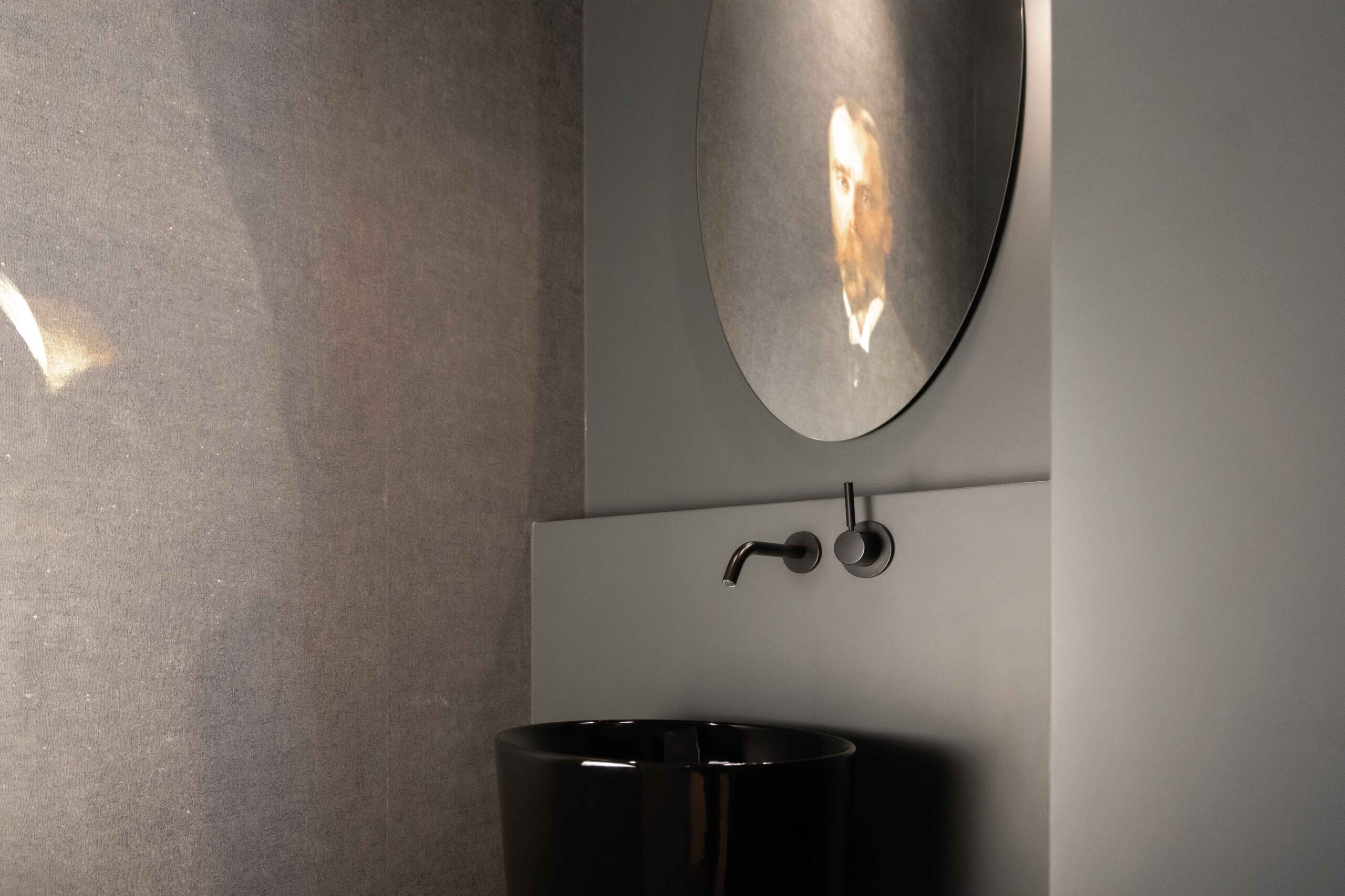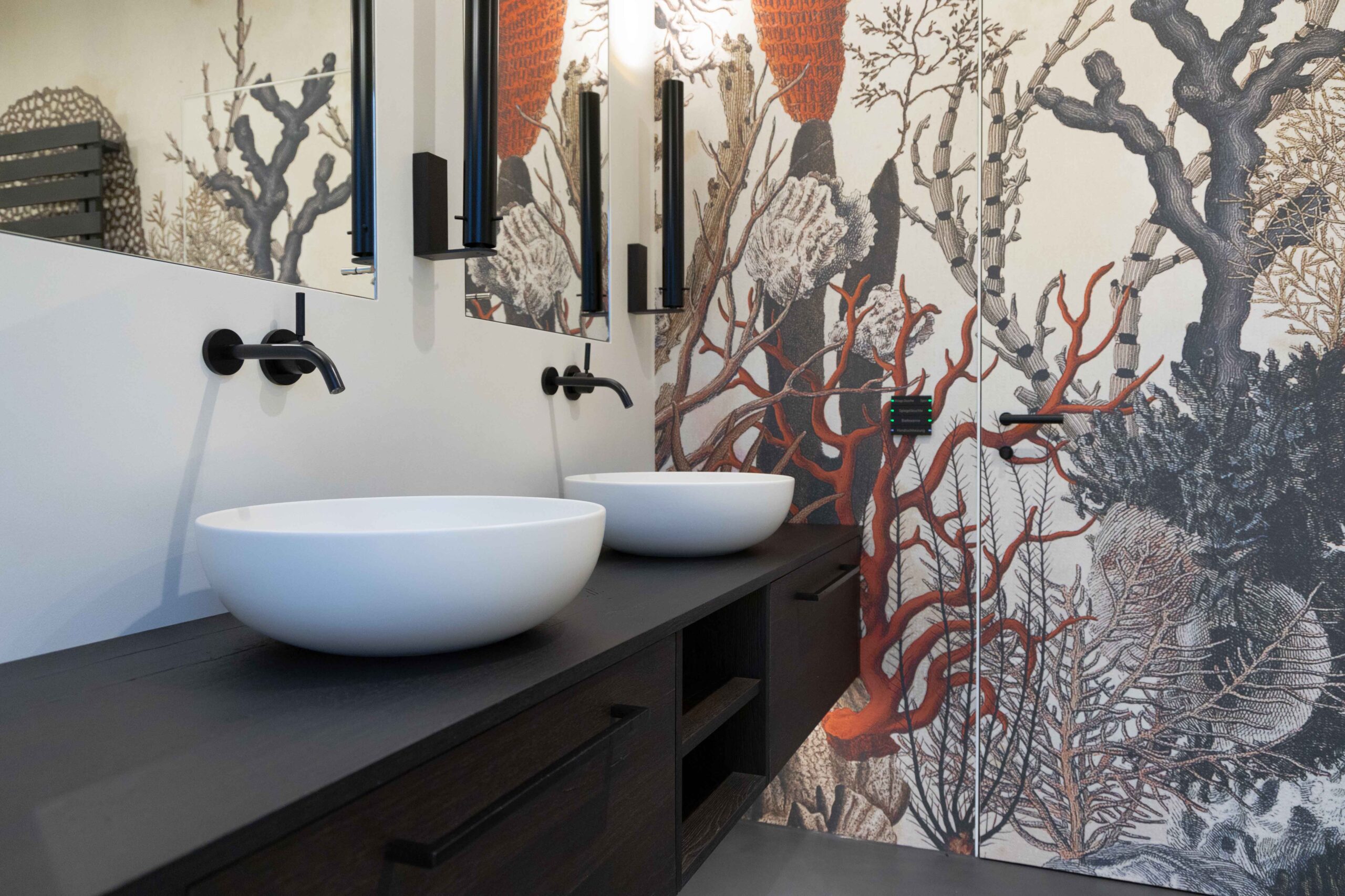 Das erste Bad trägt durch seine kräftige, orangene Korallentapete eine lebendige Atmosphäre in den Raum. Der dunkle Eichenwaschtisch mit aufliegenden Valdamar-Becken bildet einen spannenden Kontrast zur glatten Oberfläche der Becken, während der flächenbündige Spiegelschrank dezent in der Wand verschwindet. Eine fugenlose Beschichtung der Wände und Böden sorgt für ein ruhiges Gesamtbild und ermöglicht es, die Tapete bis in den Duschbereich zu ziehen.