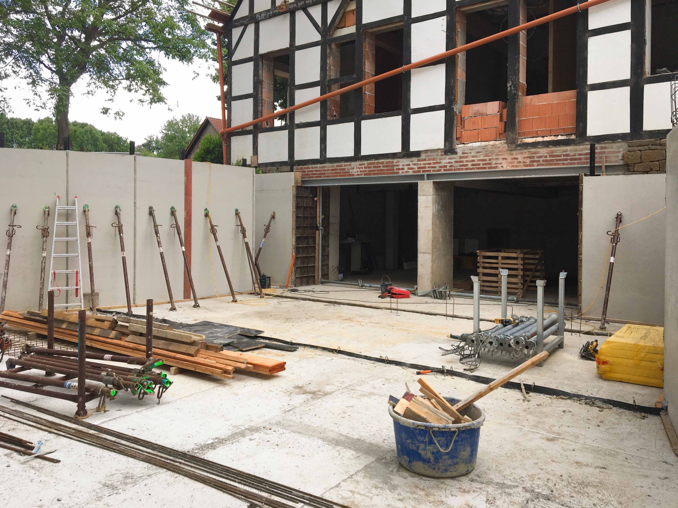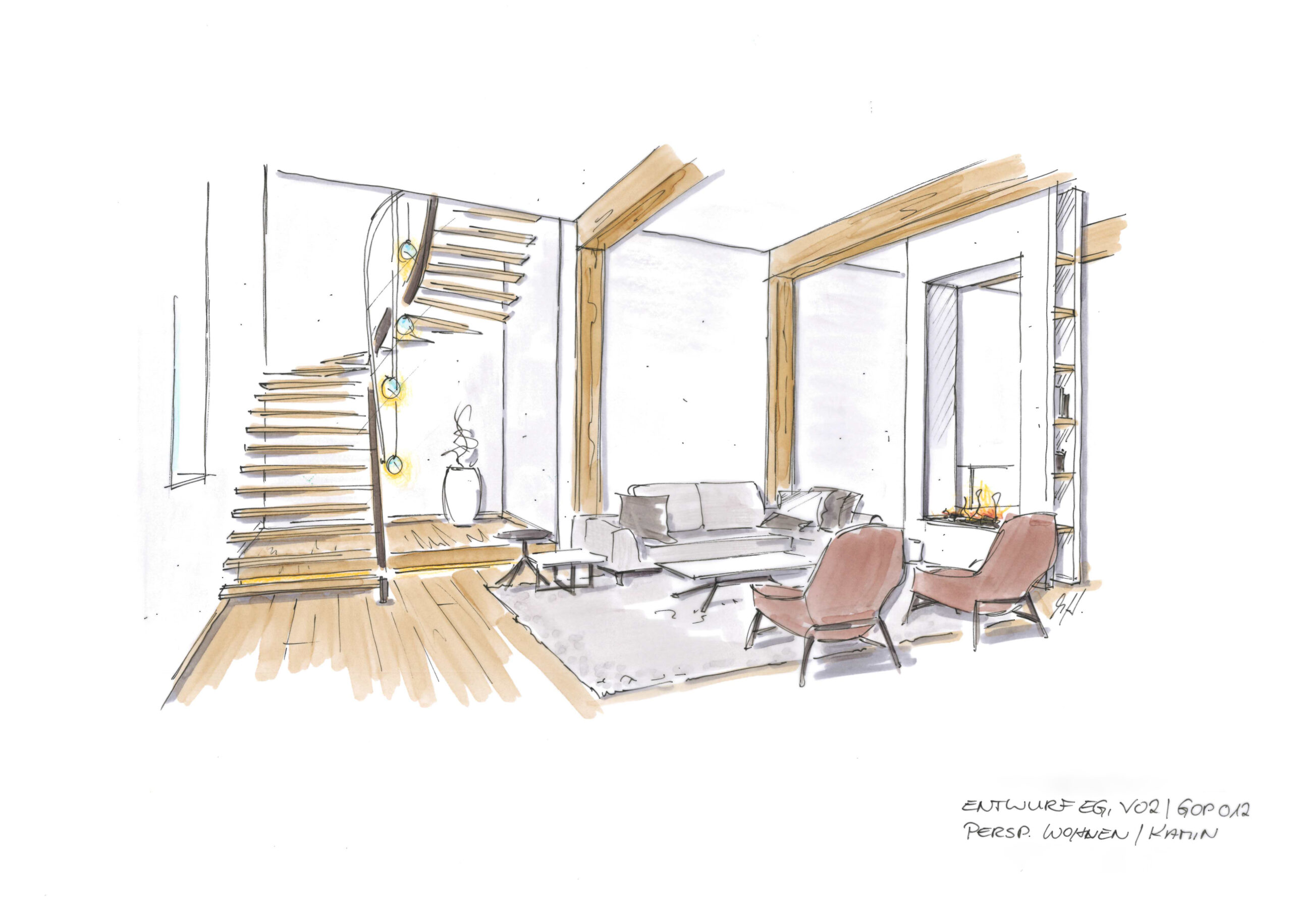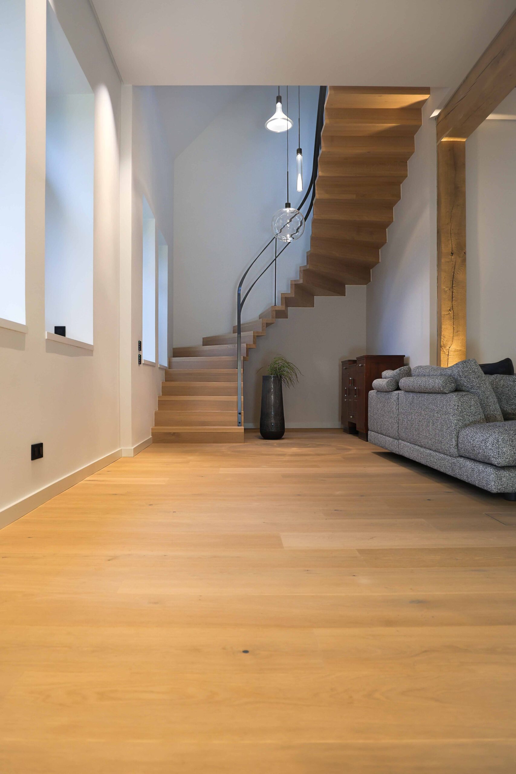 Der Start des Projekts war herausfordernd: Das bestehende Bauernhaus wurde vollständig entkernt, während die äußere Struktur und der historische Dachstuhl nach baurechtlichen Vorgaben erhalten bleiben mussten. Ein Abriss wäre nur möglich gewesen, wenn das Gebäude nach dem Verkauf drei Jahre lang bewohnt geblieben wäre – ein nicht realisierbarer Zeitraum für die Eigentümer, die bereits konkrete Pläne für ihr modernes Zuhause hatten.