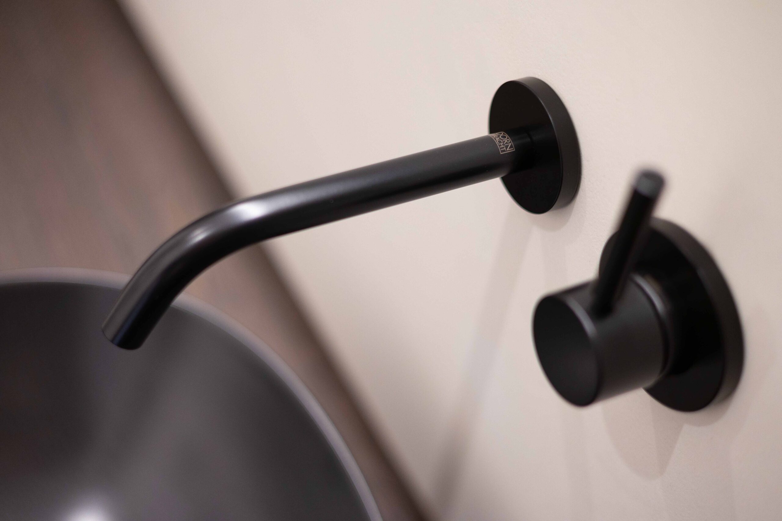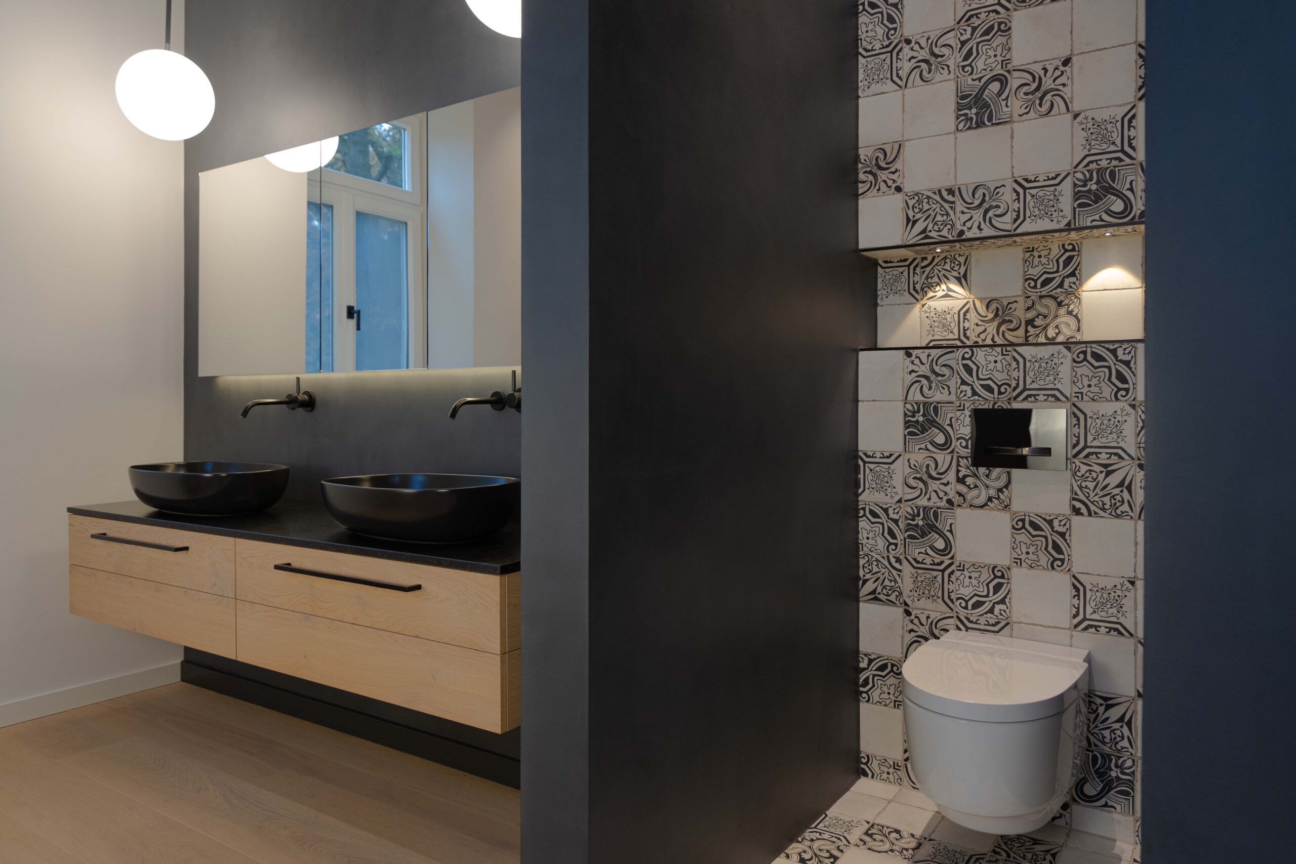 Im Badezimmer setzt sich die hochwertige Materialwahl fort. Der Waschtisch im warmen Eichendekor trägt eine satinierte Abdeckplatte aus Nero-Assoluto-Granit, auf der schwarze Keramikbecken einen markanten Akzent bilden. Steckdosen sind verdeckt in die Schubladen integriert, sodass die ruhige Erscheinung des Raumes erhalten bleibt. Ein in die Wand eingelassener Spiegelschrank sorgt für zusätzlichen Stauraum, ohne optisch in Erscheinung zu treten. Die Lignatus-Fliese „Savo“ in 15 × 15 cm zieht sich als gestalterisches Highlight und markanter Blickfang durch den WC-Bereich – ein bewusst gesetzter Kontrast zum klaren, zurückhaltenden Design der restlichen Raumgestaltung.