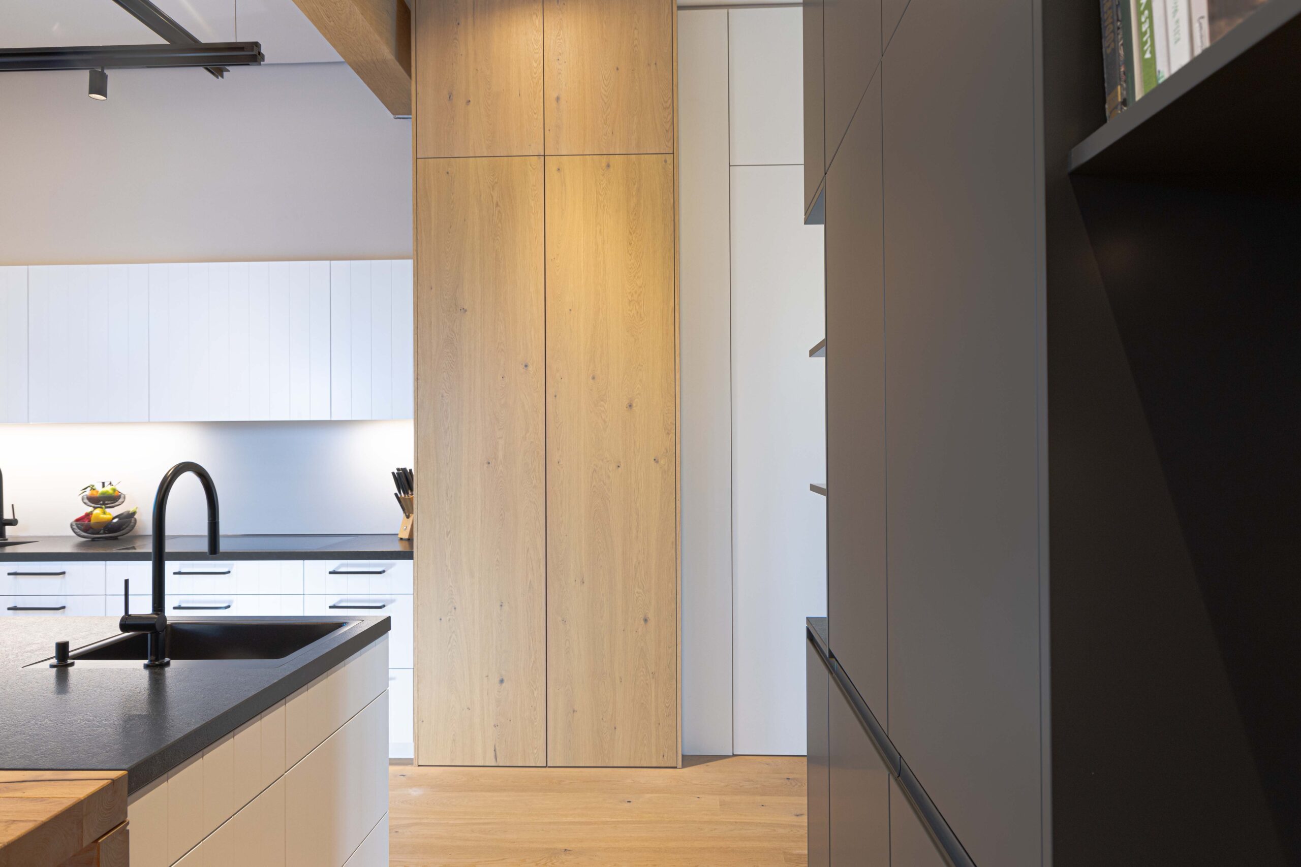 Geriffelte Oberflächen, schwarze Griffe und matt schwarze Armaturen setzen gezielte Akzente. Ein raumhoher Hochschrank in Anthrazit schafft großzügigen Stauraum, während die weiße Küchenzeile einen hellen Gegenpol zu Eichenstützen und Balken bildet. Der gesamte Bereich wirkt offen und leicht, ohne den rustikalen Ursprung zu verlieren.