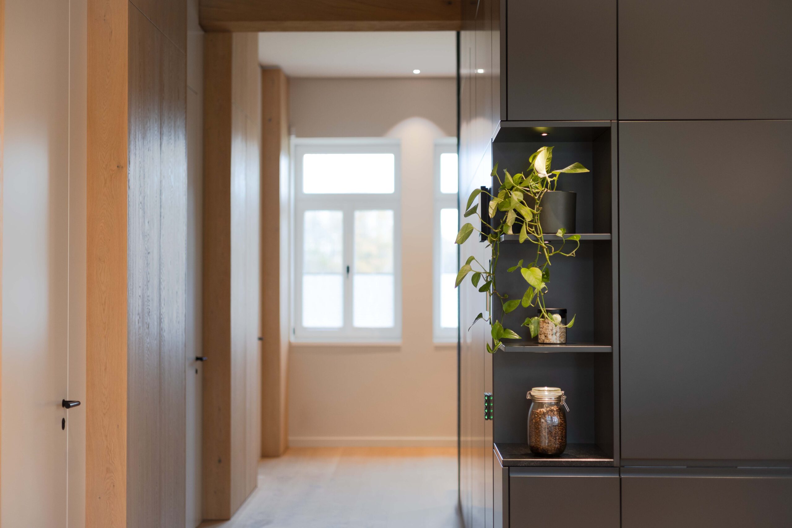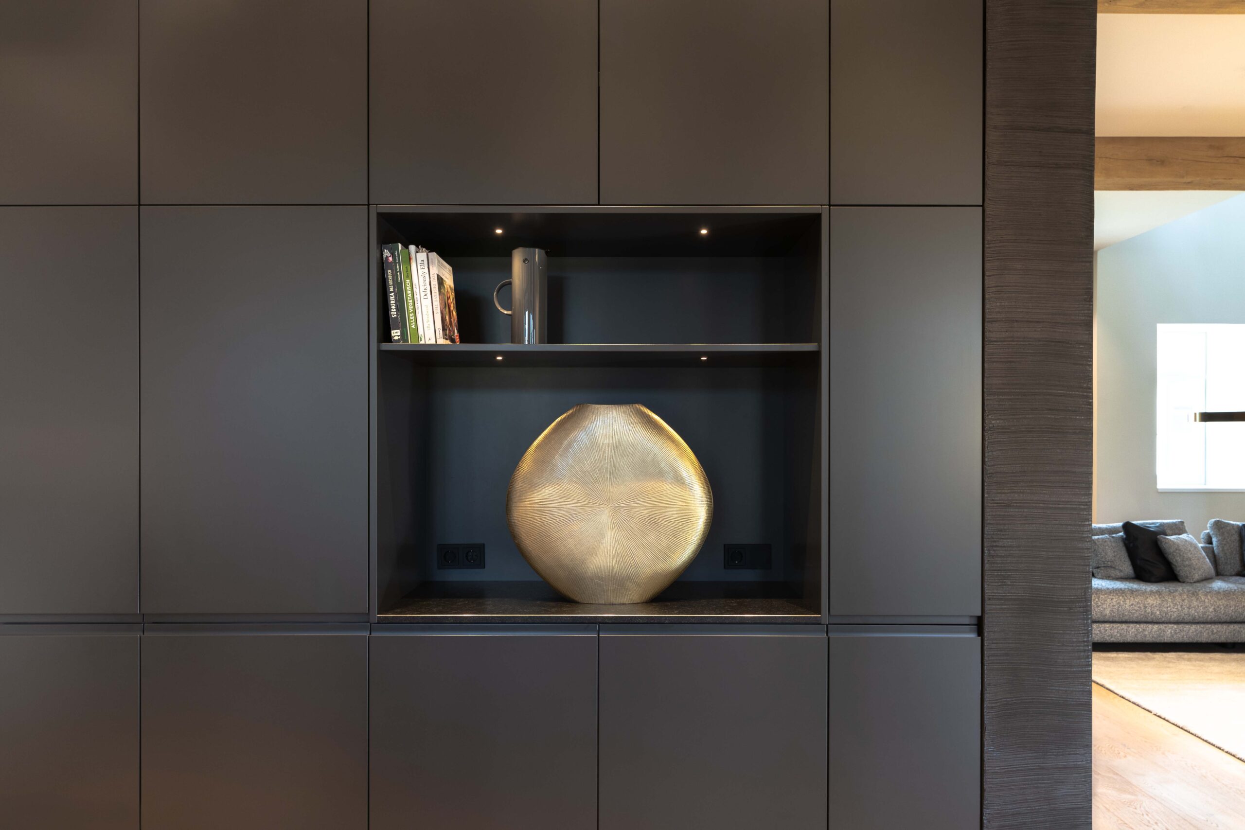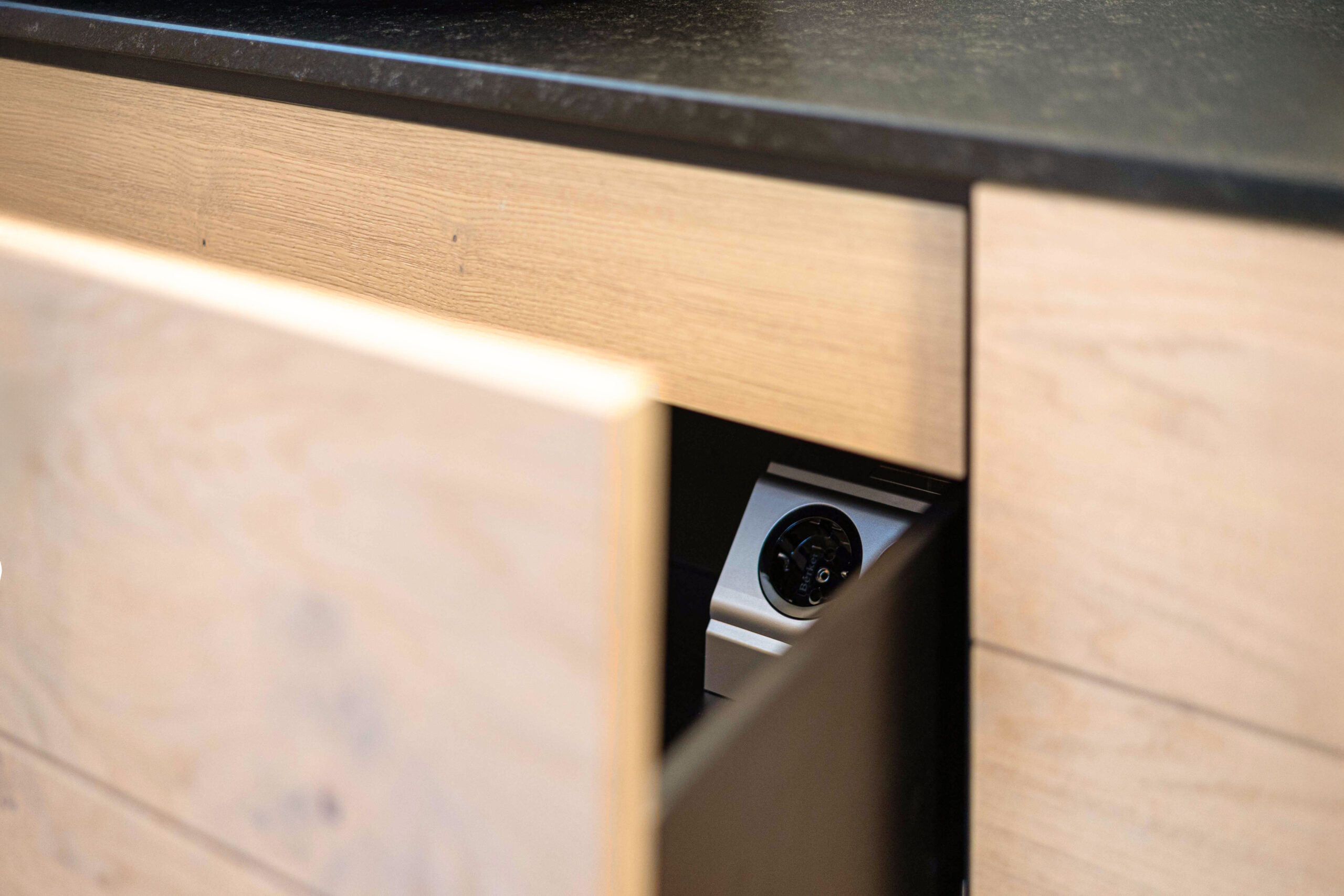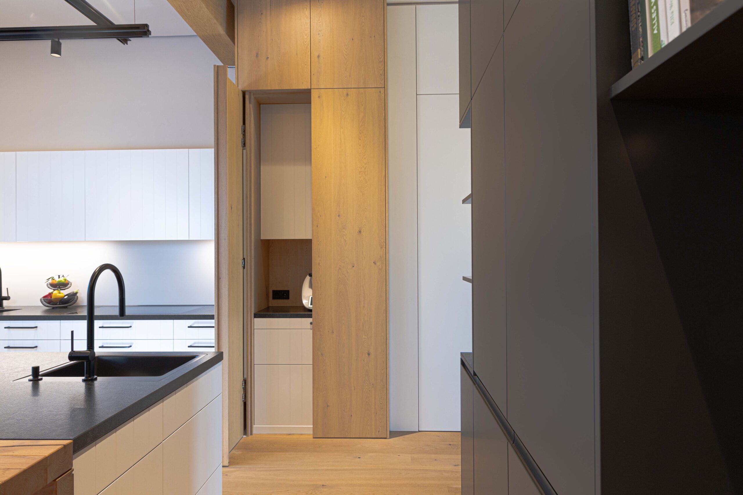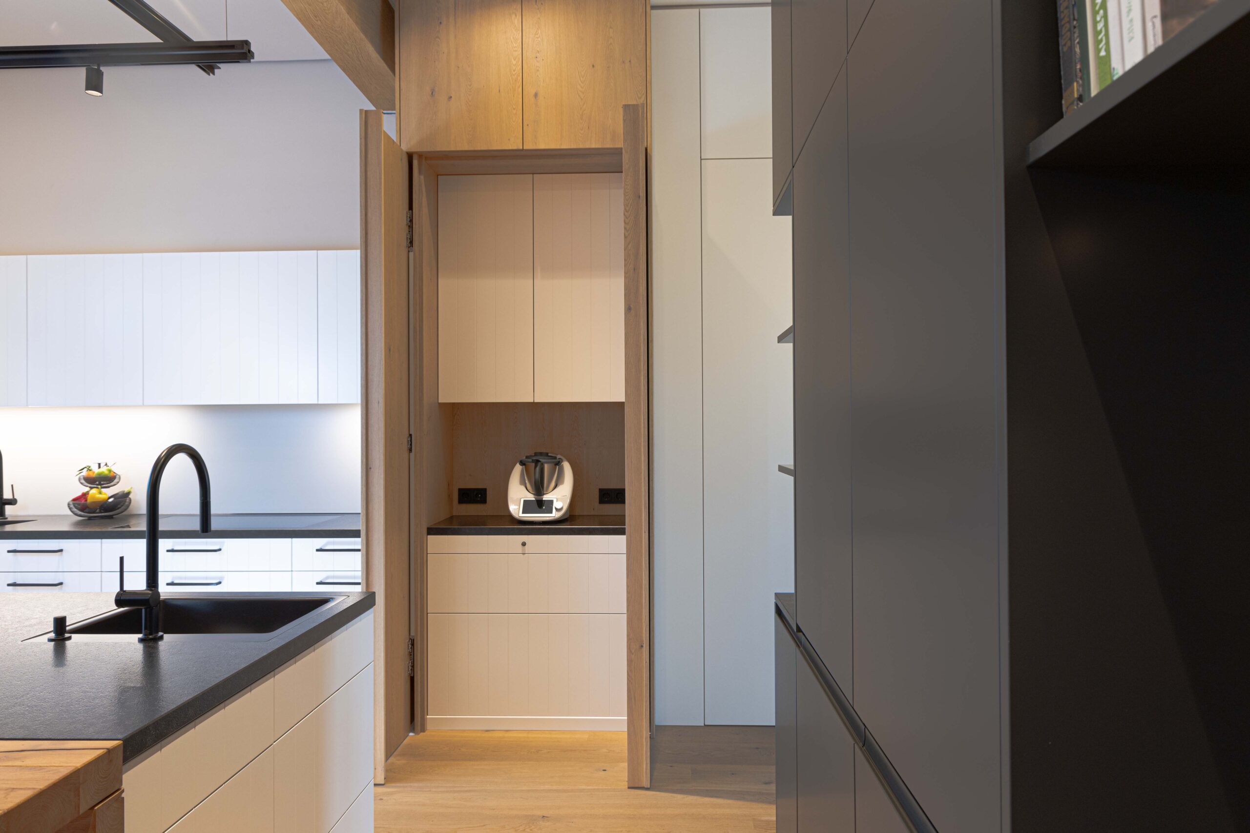 Die klare Linienführung und Ästhetik einer modernen Küche werden schnell durch Küchengeräte wie Airfryer, Toaster oder Thermomix unterbrochen. Die Arbeitsplatte ist zugestellt, der Raum wirkt unruhig und überfüllt. Um dies zu vermeiden, wurde neben der Küchenzeile ein großzügiger Eichenschrank integriert, dessen Türen vollständig in den Seitenwänden verschwinden können. So entsteht ein zusätzlicher Arbeitsbereich mit viel Stauraum und einer ergänzenden Arbeitsfläche, die als fester Platz für Elektrogeräte dient. Möchte man den Blick auf diese Geräte vermeiden, lassen sich die Türen mit zwei Handgriffen schließen – ein eleganter Lösungsansatz, der Alltagstauglichkeit und hochwertige Gestaltung vereint.