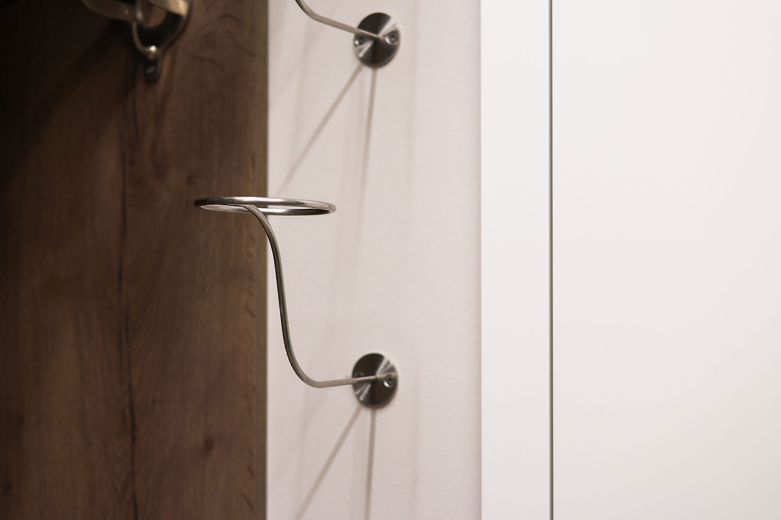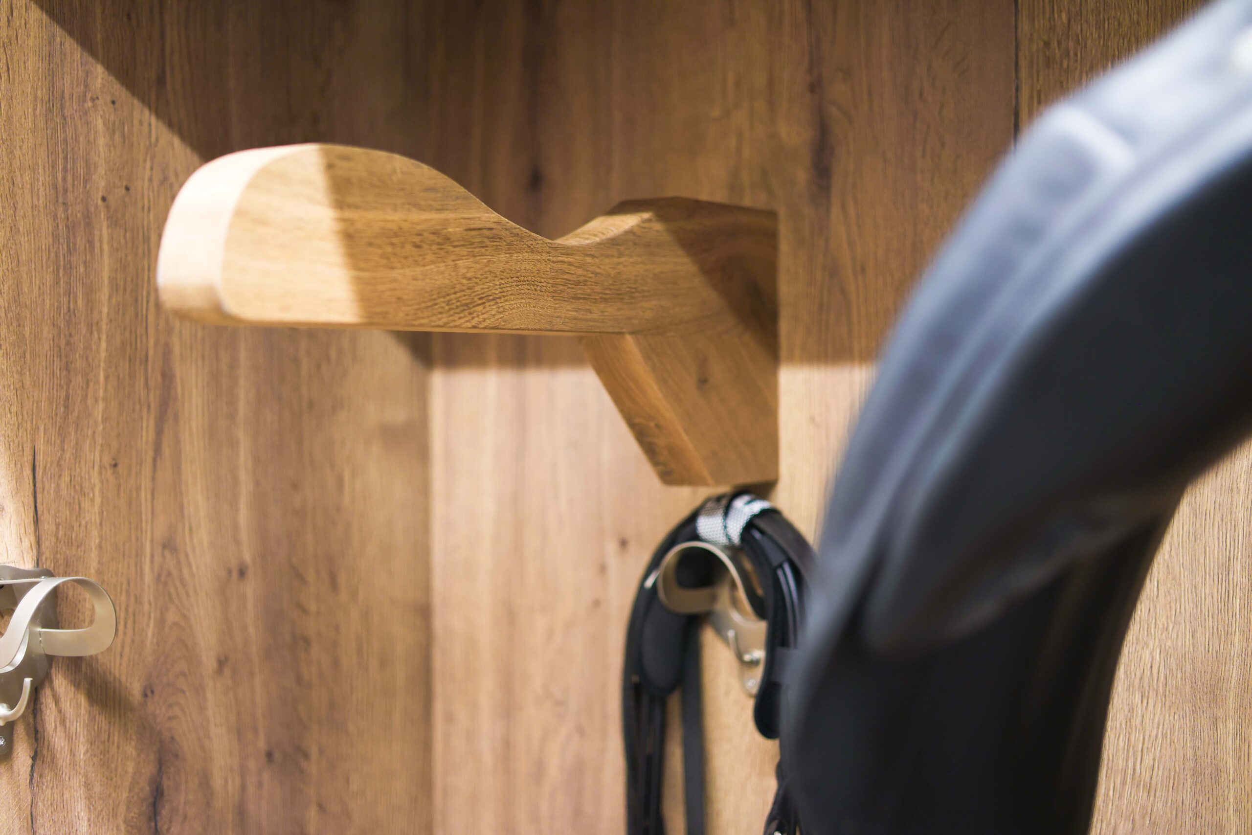 Für die Aufbewahrung der Reitausrüstung entwarfen wir robuste Sattelhalterungen aus massiver, heimischer Eiche, die mit hoher Traglast ausgelegt sind und damit auch den täglichen Anforderungen im Stall mühelos standhalten. Die Halterungen für Schabracken sind beidseitig schwenkbar konstruiert, was eine besonders komfortable Entnahme ermöglicht. Ergänzend dazu wurden die Reithelmhalter aus Edelstahl gefertigt – eine langlebige, hygienische Lösung, die sich mit ihrem minimalistischen Design unaufdringlich in das Gesamtbild einfügt.