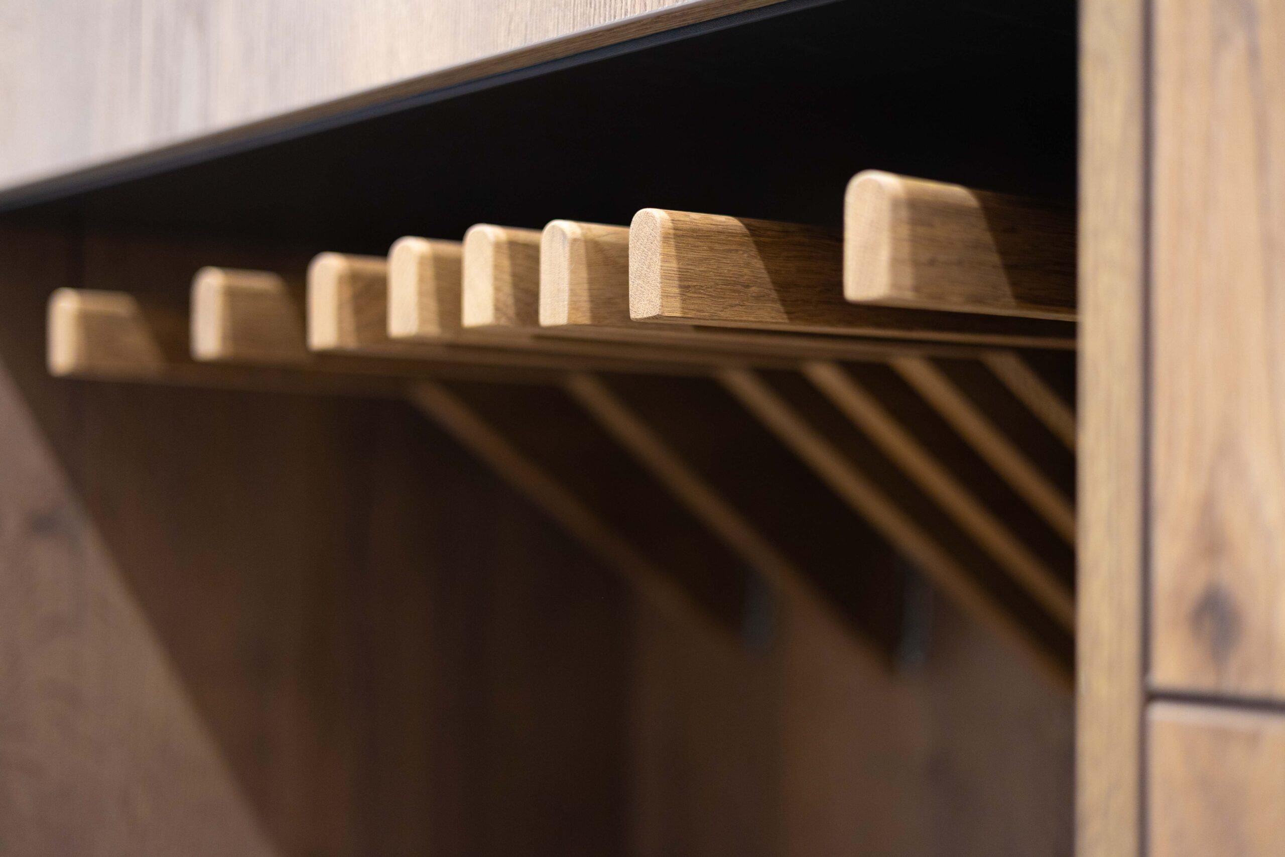 Bei der Bauernhaus-Sanierung im Tecklenburger Land wurde besonderer Wert auf natürliche Materialien gelegt. Die Möblierung verbindet pflegeleichte Oberflächen in Eichendekor mit massiven Eichen-Elementen aus heimischen Wäldern. Die Arbeitsfläche bietet Platz für Vorbereitung und Pflege der Ausrüstung, während auch hier genügend Stauraum Ordnung und Übersicht garantiert. Praktischen Komfort schafft zudem ein integrierter Kühlschrank mit BioFresh-Fach – ideal, um Getränke kühl zu lagern oder die Karotten fürs Pferd frisch zu halten.