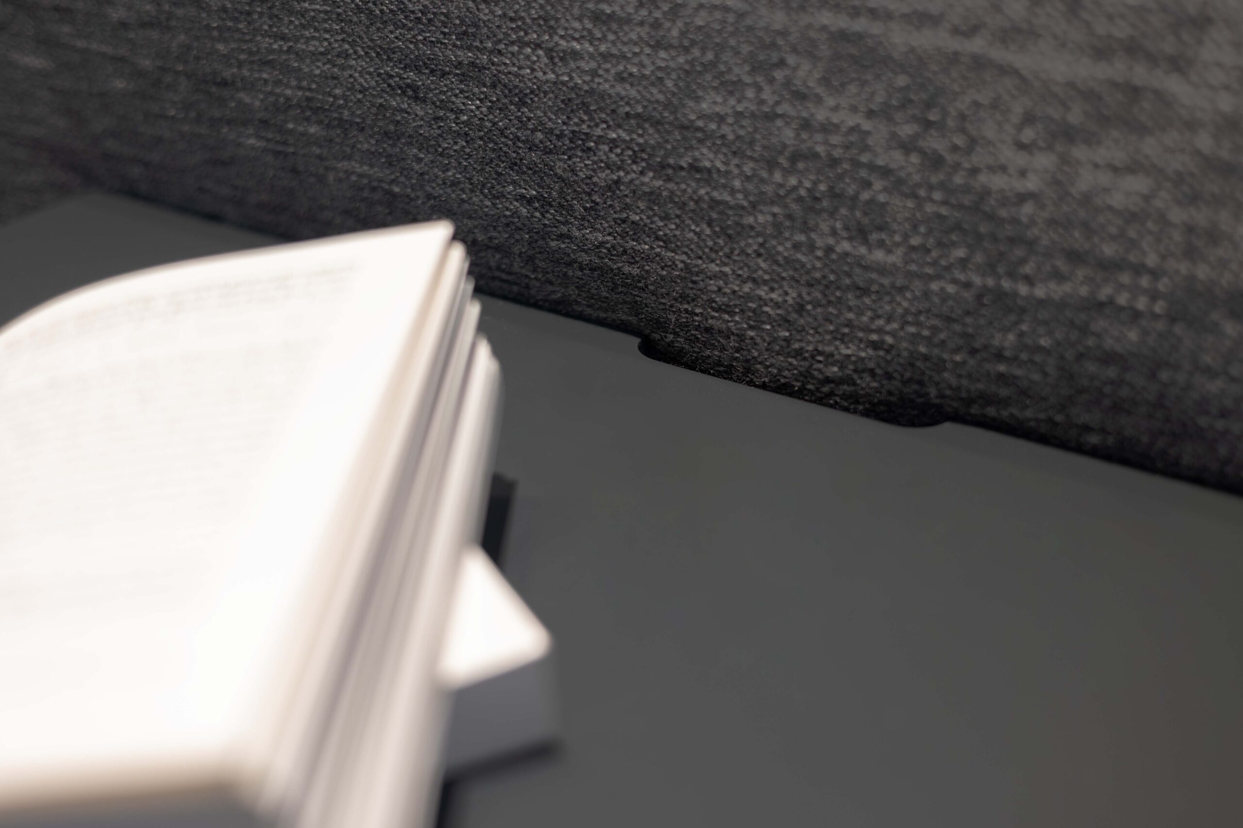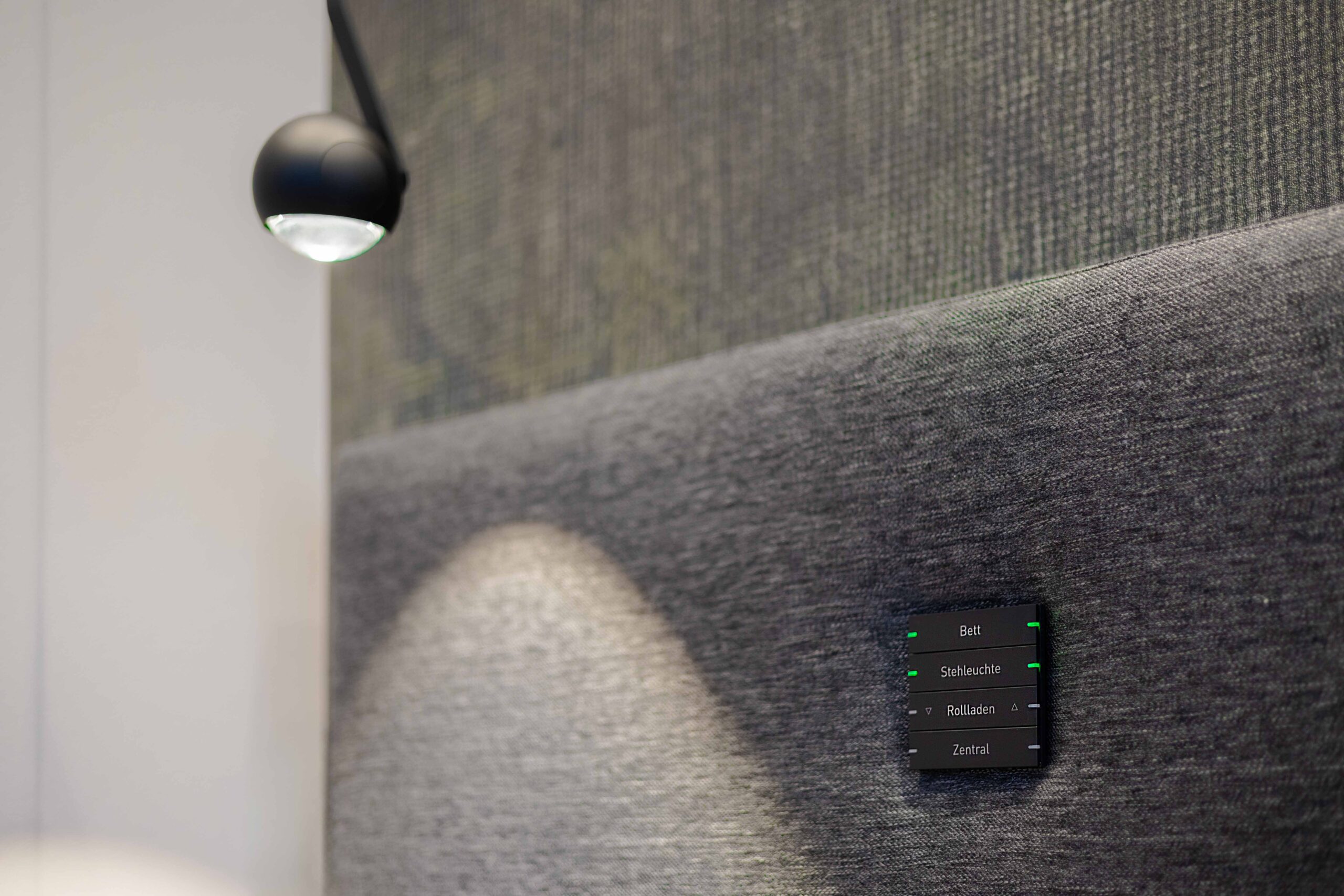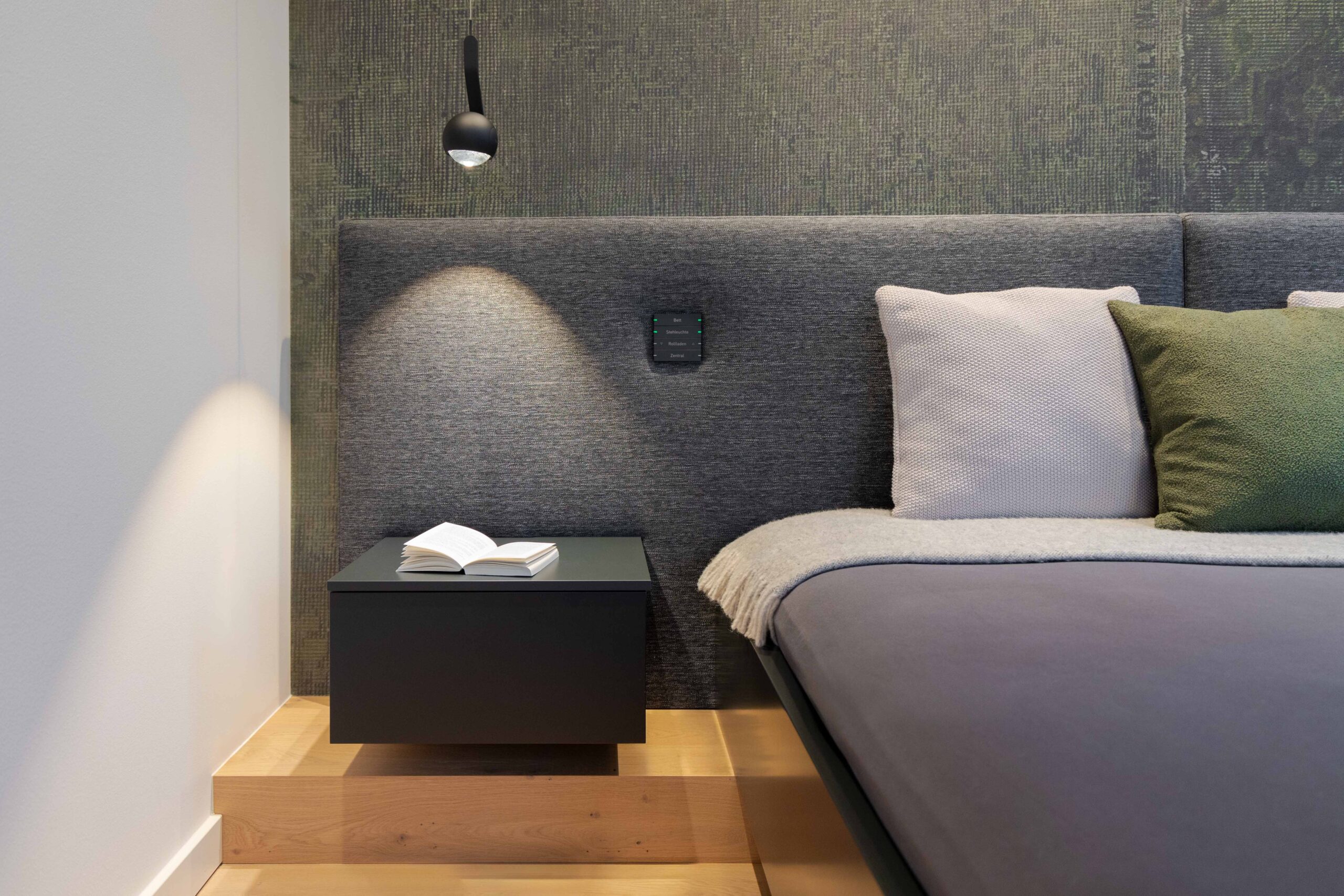 Ein maßgefertigtes Bett, in edlem Anthrazit lackiert und präzise auf Gehrung gearbeitet, bildet den Mittelpunkt dieses Schlafzimmers. Das weich gepolsterte Kopfteil sorgt für Komfort und verbirgt zugleich eine unauffällige GIRA-Steuerung für Licht und Technik. Mehr über die GIRA-Steuerungssysteme erfahren Sie hier.