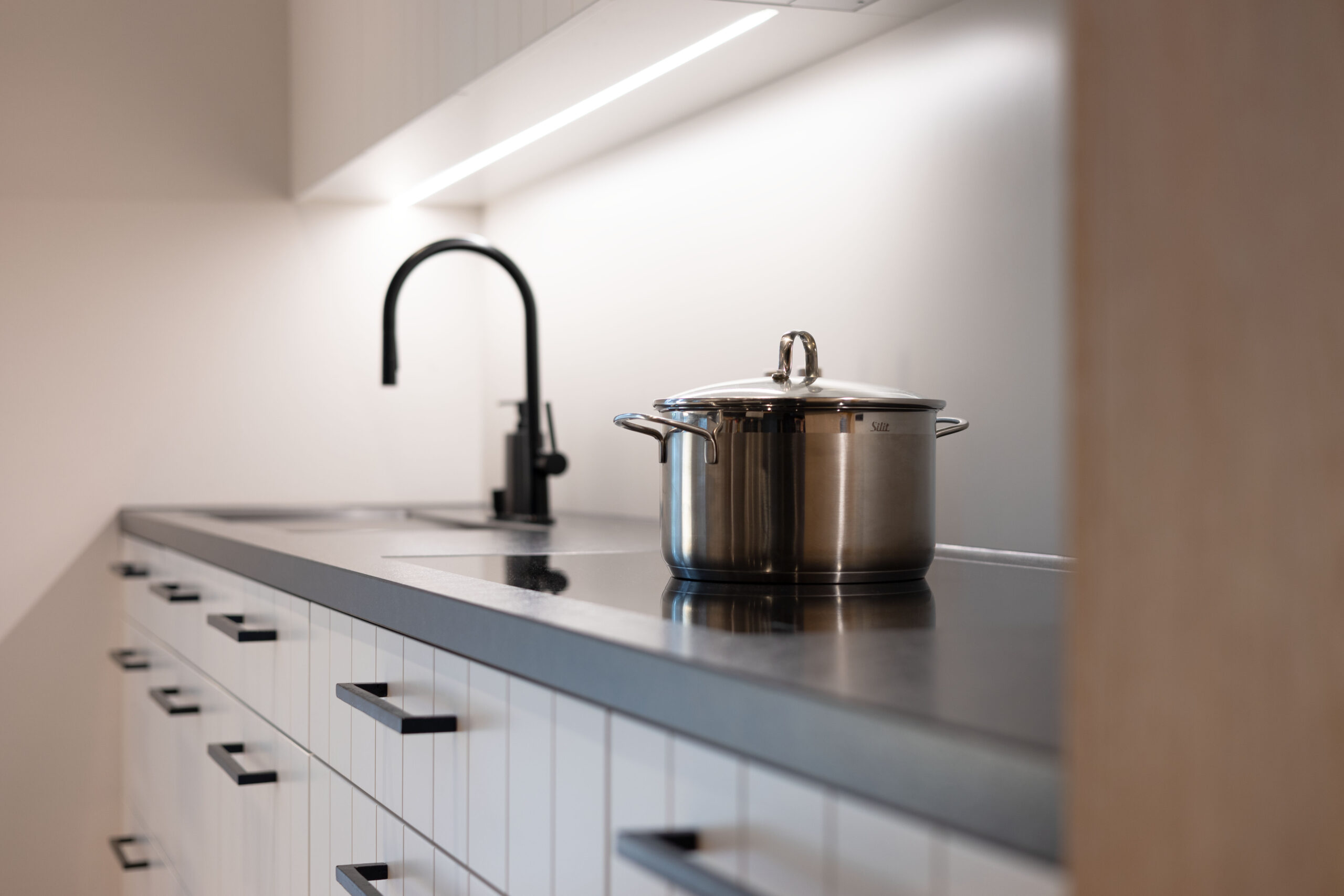 In den Regalboden eingelassene LED-Streifen setzen bewusst Lichtakzente und sorgen zugleich für gute Sicht auf den Arbeitsflächen. So entsteht ein funktionaler Bereich, der Robustheit mit handwerklicher Ästhetik verbindet.