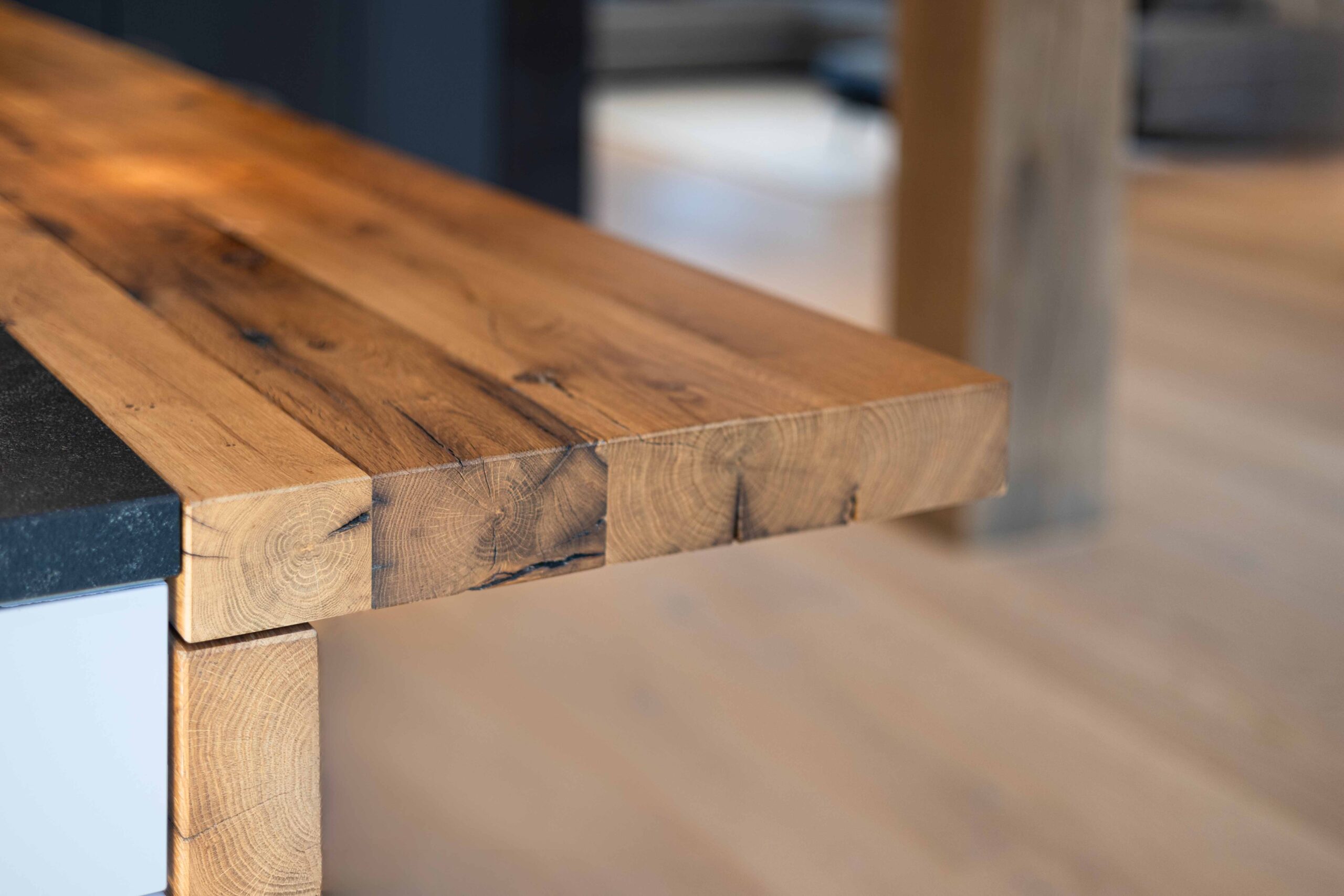 Das Herzstück des Hauses ist die Küche. Die markante Theke besteht aus historischen Eichenfachwerkbalken, die im Zuge der Bauernhaus-Sanierung geborgen und sorgfältig aufgearbeitet wurden. Ihr lebendiger Charakter bildet einen spannenden Kontrast zur glatten, dunklen Granit-Arbeitsplatte und den klar gestalteten Fronten.