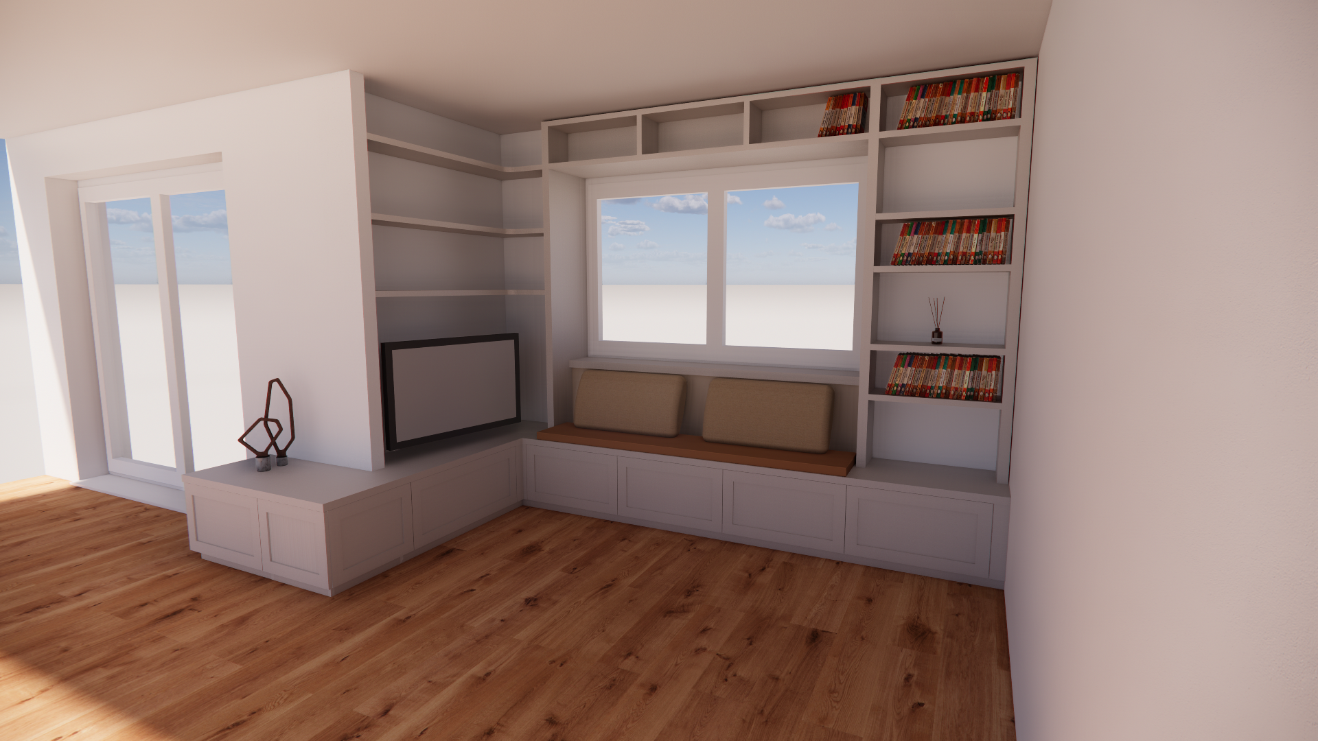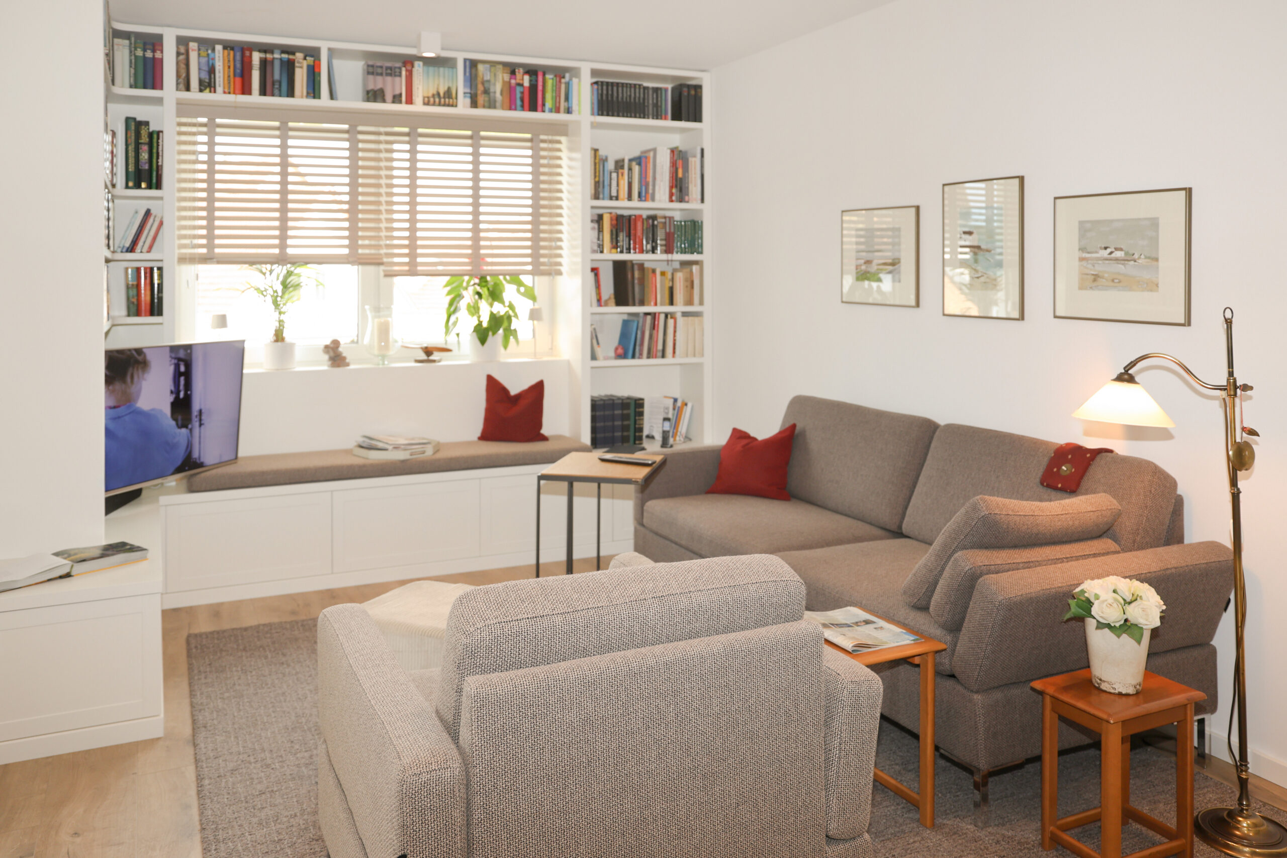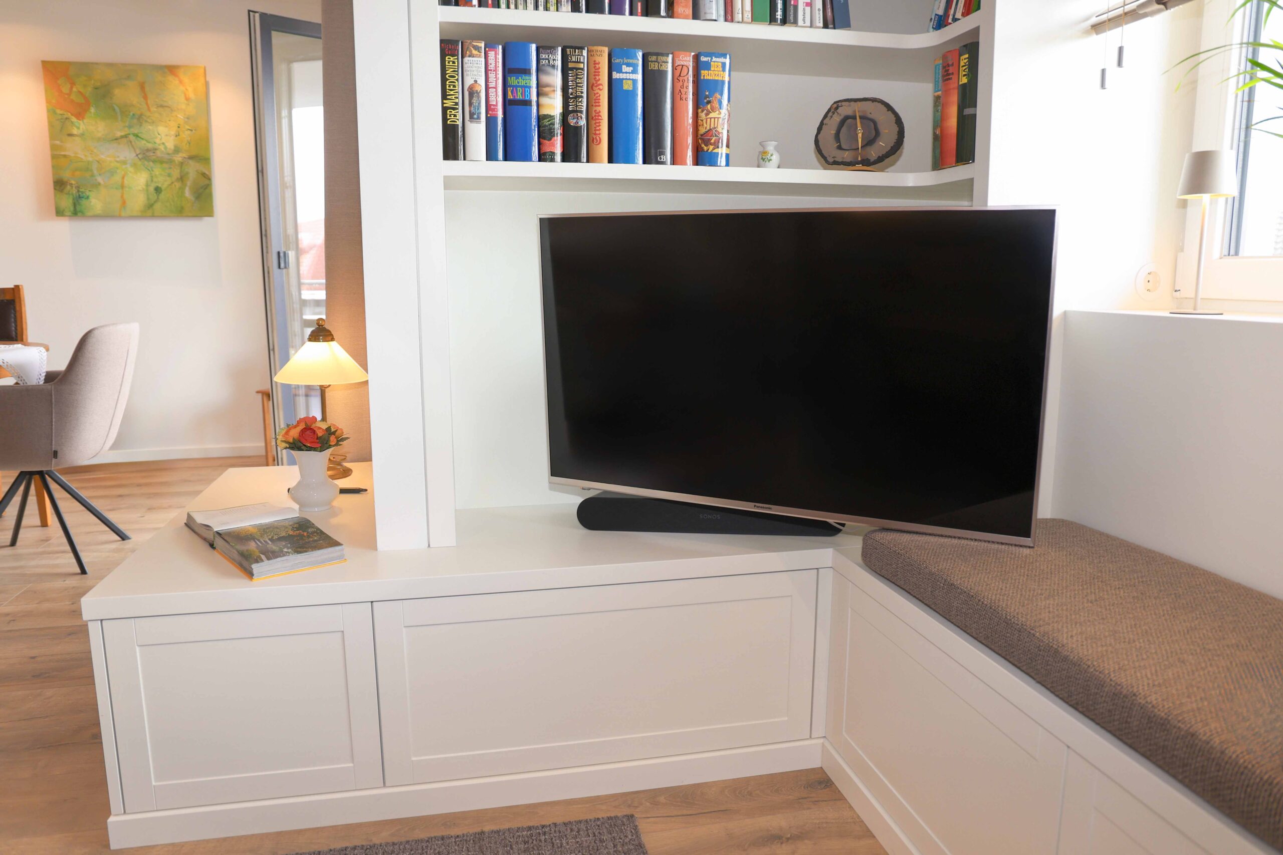 Die Kompaktheit des vorhandenen Wohnzimmerbereiches erforderte die Planung von ausreichendem Stauraum, der sich dezent in das Raumkonzept einfügt.