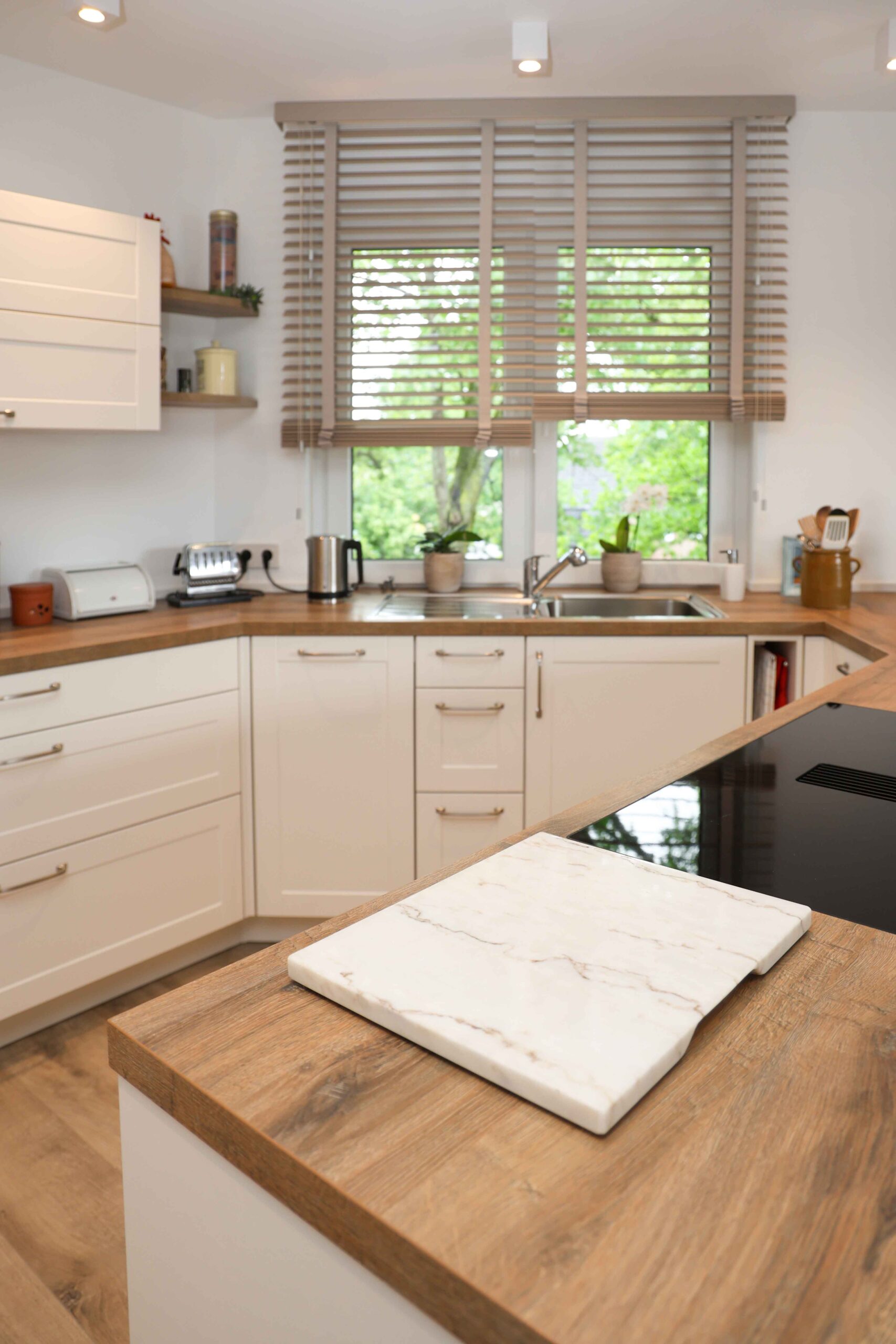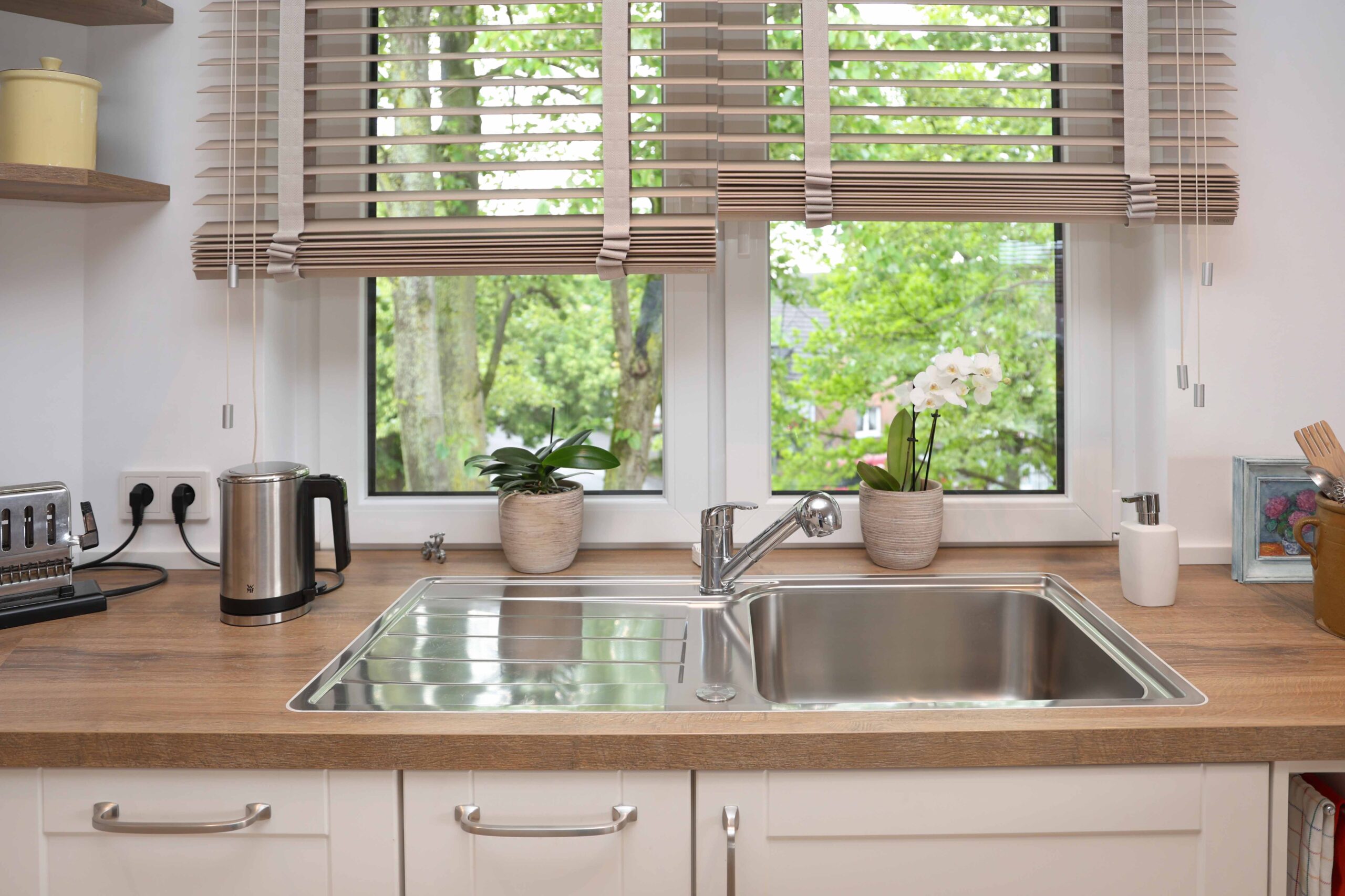 Die neue Küche – konzipiert als Lignatus Hybrid-Küche – orientiert sich am Erscheinungsbild der alten Küche, die vom Lignatus-Team vor ca. 10 Jahren umgestaltet wurde. Die gelieferten Nobilia -Küchenmöbel wurden für diese Wohnung mit den gleichen maßgefertigten Rahmenfronten versehen wie die alte Küche der Kunden. Gut durchdacht ist die präzise Positionierung des Wasserhahns mit ausziehbarer Schlauchbrause vor dem Fenster, damit beide Fensterflügel problemlos zu öffnen sind.