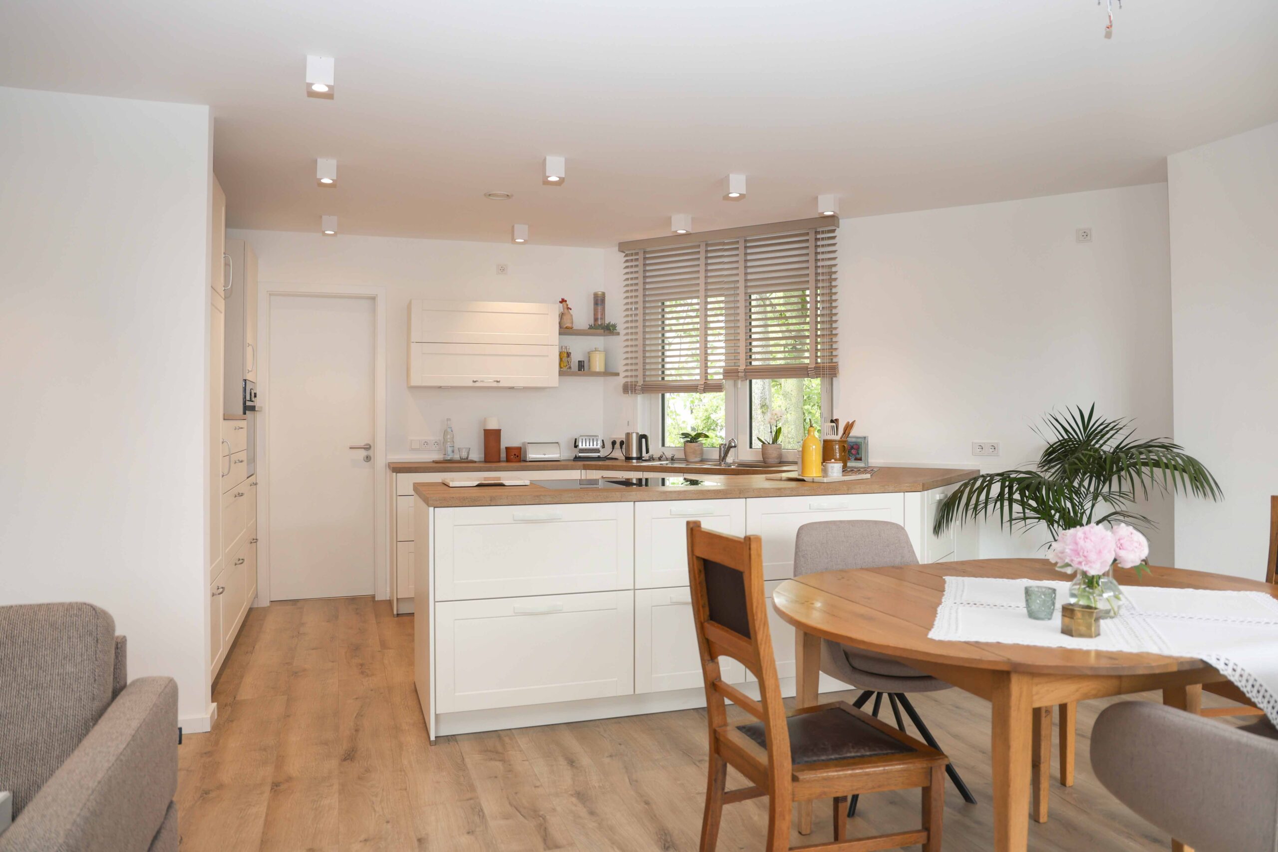 Wohn-, Essbereich und Küche gehen nahtlos ineinander über und ergeben ein stimmiges Raumkonzept. Hier ist ein gelungener Wohnmittelpunkt entstanden.