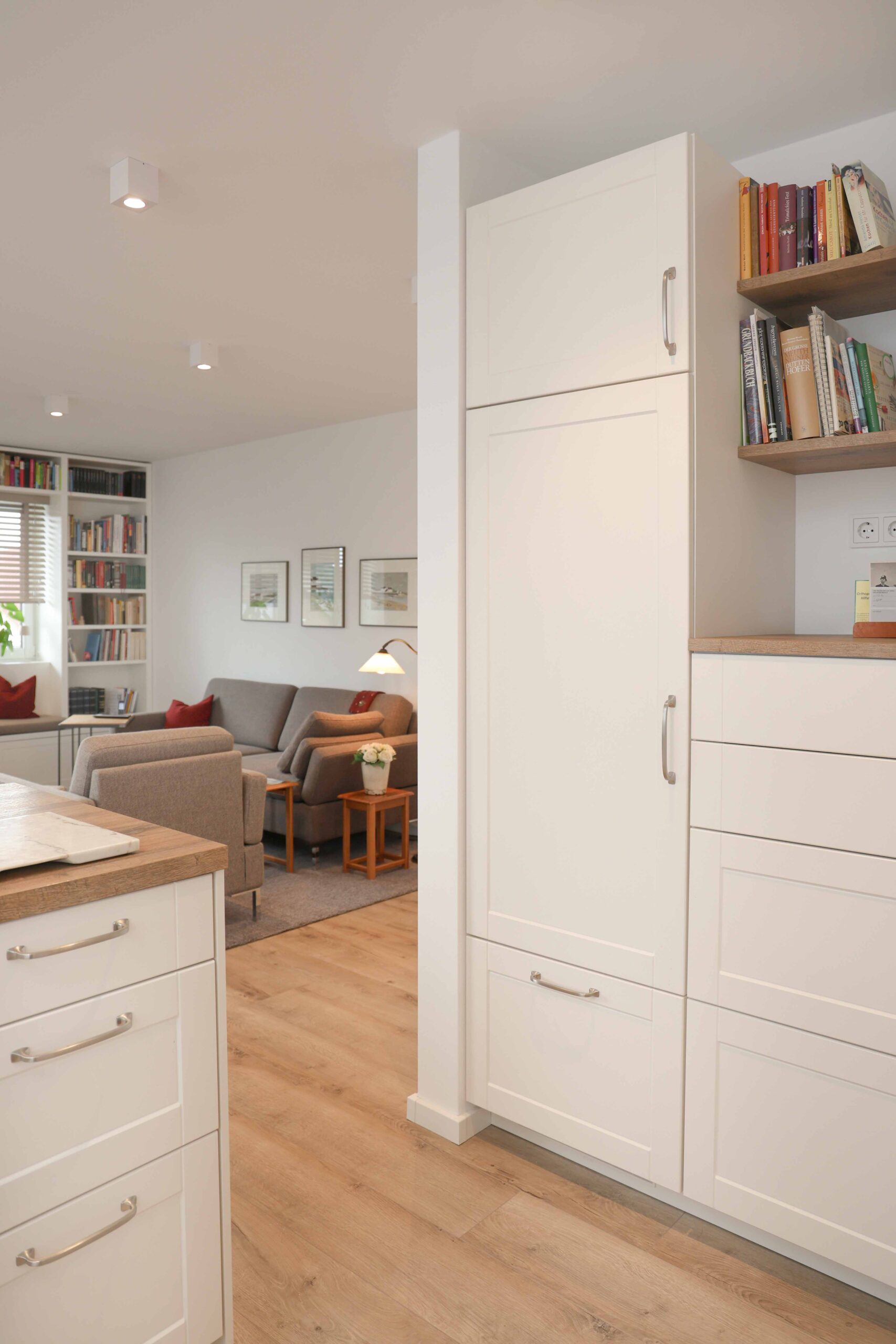 Hierfür wurden grifflose Fronten gewählt, die sich mittels Push-to-open Beschlägen geschmeidig öffnen und schließen lassen. Die auf Maß gefertigte Wohnwand orientiert sich an den Rahmenfronten der Küche und wurde zusätzlich mit einer aufwändigen Hand-Strichlackierung veredelt.