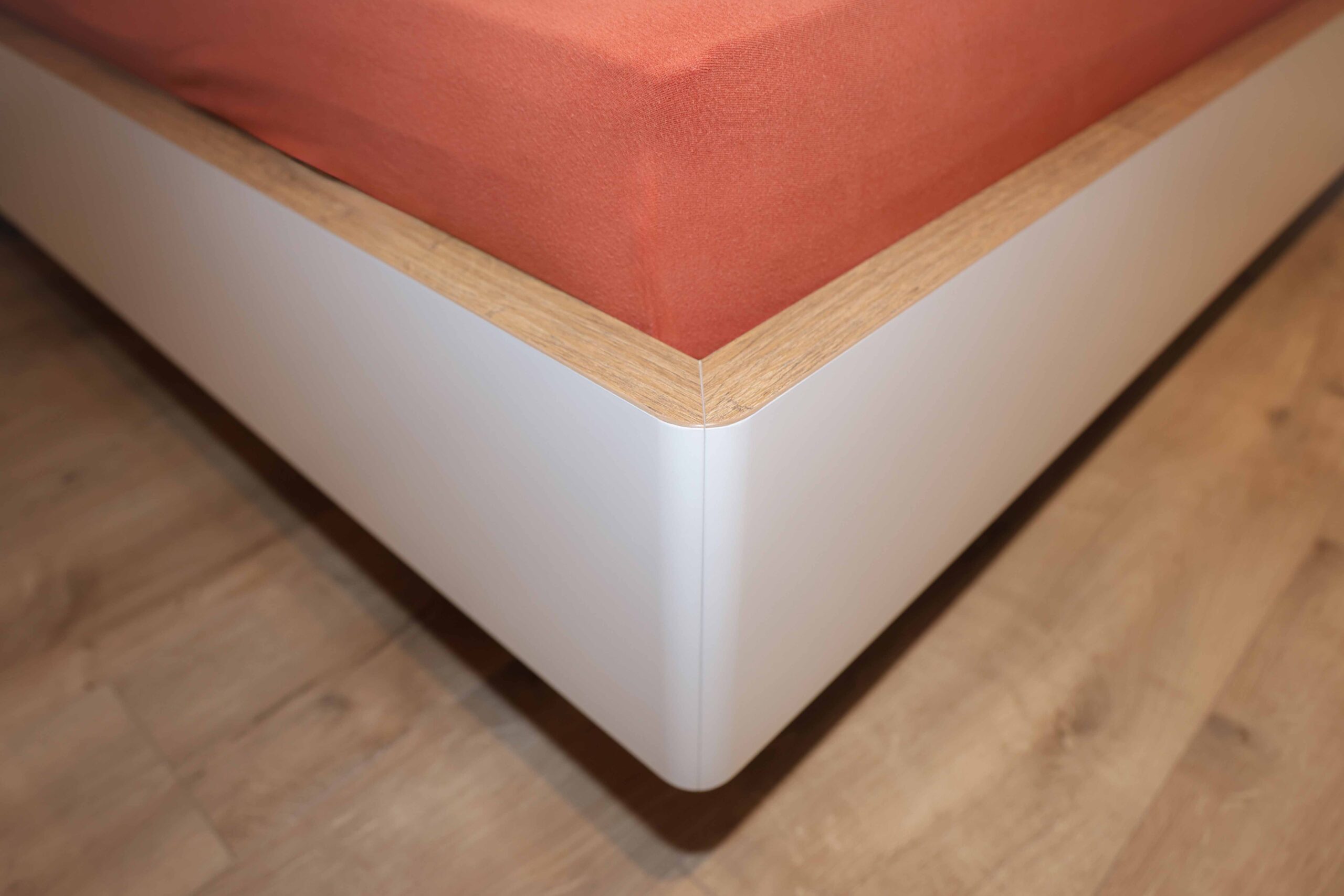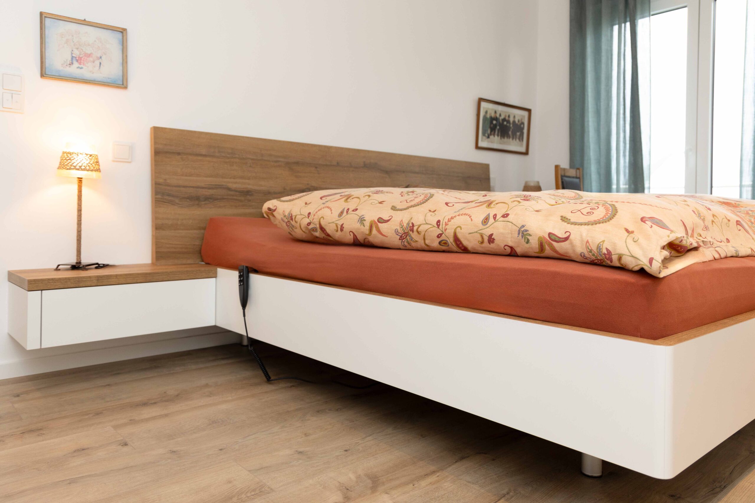 Auch in diesem Raum sprechen die handwerklichen Details für sich: Die Ecken des weißen Bettrahmens sind abgerundet und von Hand lackiert. Die Schubladen laufen leicht und geräuschlos und schließen wie von selbst. Der raumhohe Schlafzimmerschrank überzeugt mit viel Stauraum für Kleidung, Bettdecken und Alltagsgegenstände. Ein integrierter Fernseher ermöglicht entspanntes Fernsehen direkt vom Bett – ganz im Sinne eines komfortablen, modernen Wohnens im besten Alter.