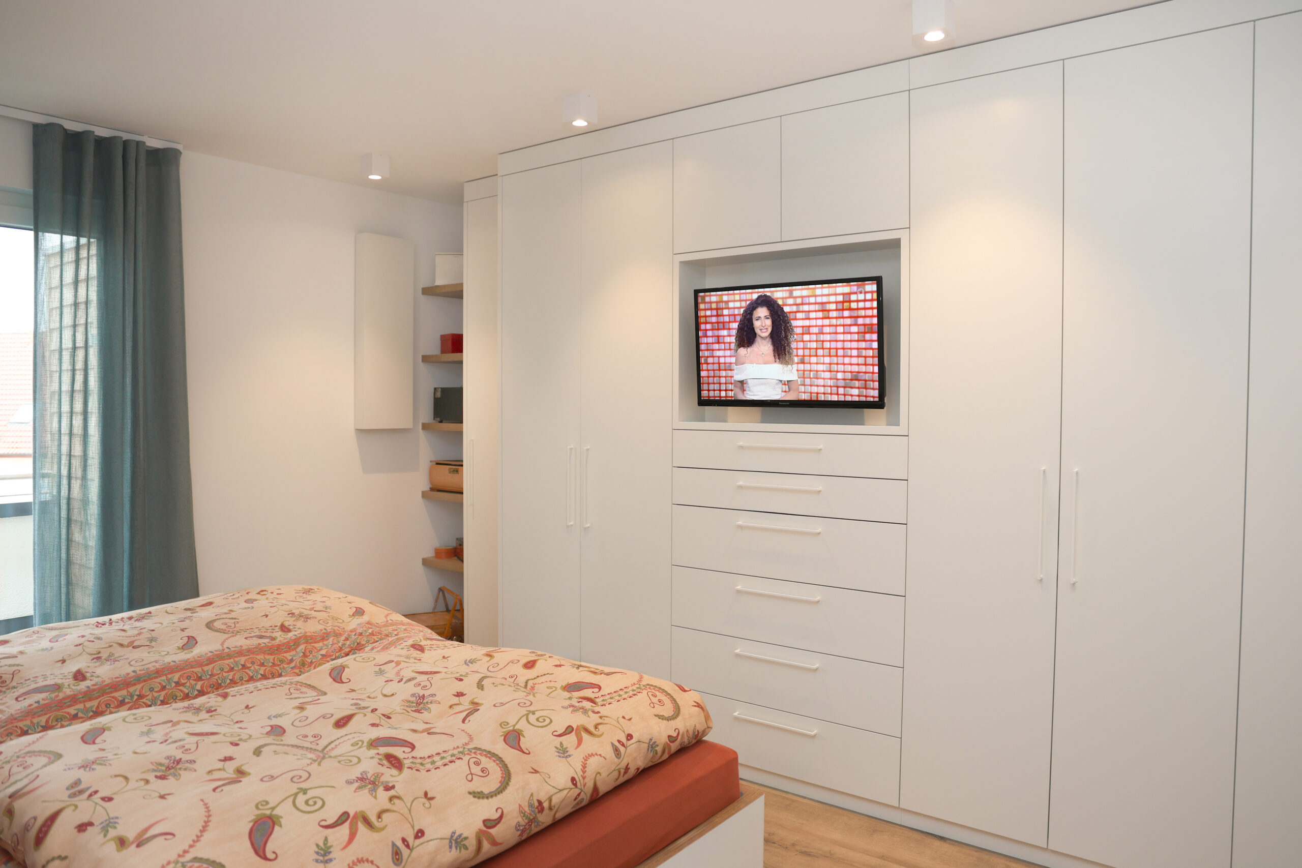 Auch im Schlafzimmer wurde der klare funktionale Stil der Wohnung beibehalten: Die Schrankwand mit ihren mattweiß lackierten Fronten und den weißen Griffen fügt sich fast nahtlos in das Zimmer ein. Die Wandnische mit dem Raumlüfter wird durch offene Regalfächer clever genutzt – so entsteht zusätzlicher Stauraum und der Wartungszugang zum Gerät bleibt erhalten. Passend zum Fußboden setzen die Eichenteile des Bettes sowie der Nachtkonsolen einen farblichen Akzent.