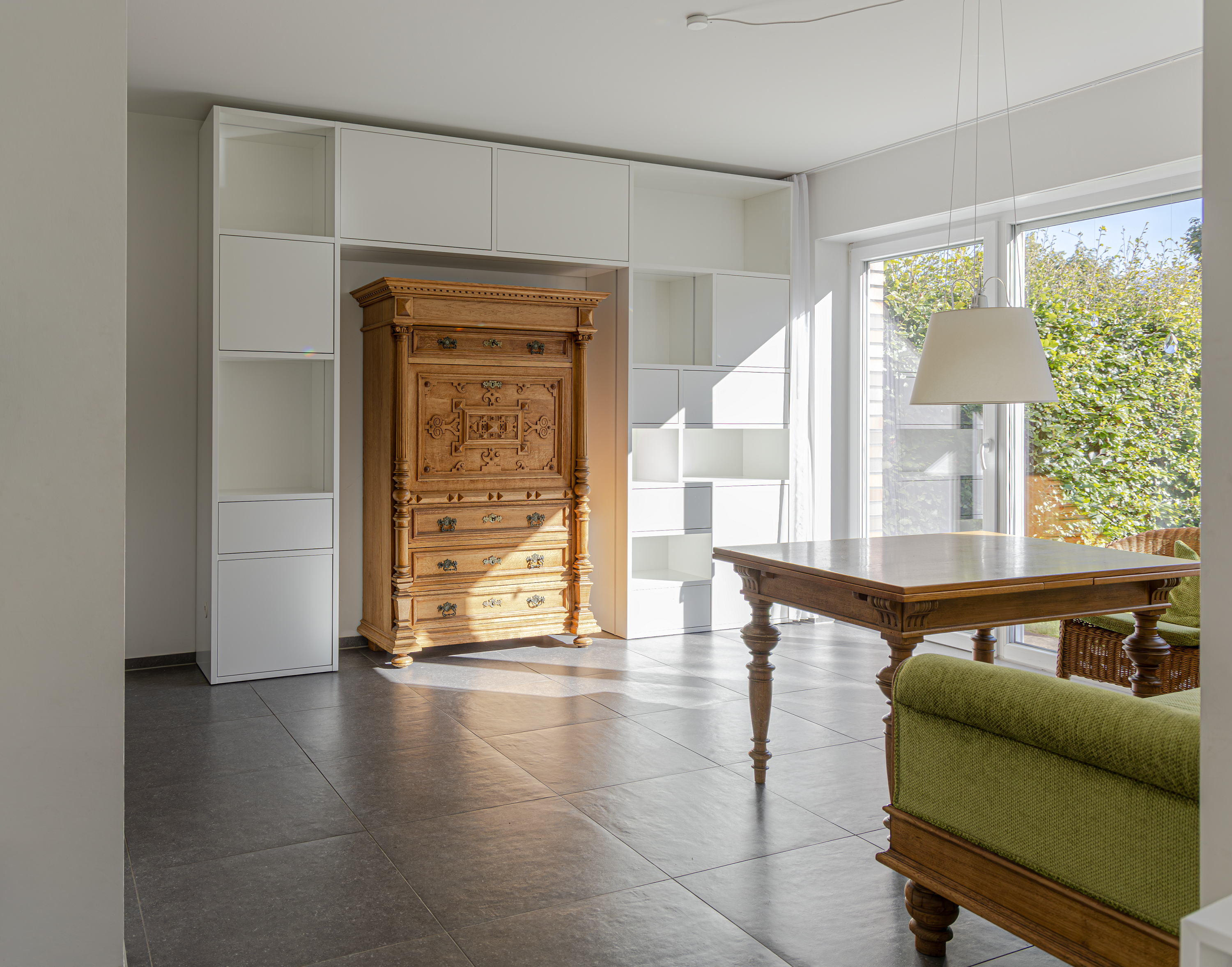 Eine individuelle Möbellösung ist besonders dann gefragt, wenn vorhandene Möbelstücke mit persönlichem Wert in ein modernes Wohnkonzept integriert werden sollen. In diesem Esszimmer stand ein geerbter antiker Eichenschrank im Mittelpunkt, der durch Massivholz und reiche Verzierungen geprägt ist. Ziel war es, dem historischen Möbel einen würdigen Platz zu geben und es zugleich funktional in den Raum einzubinden.